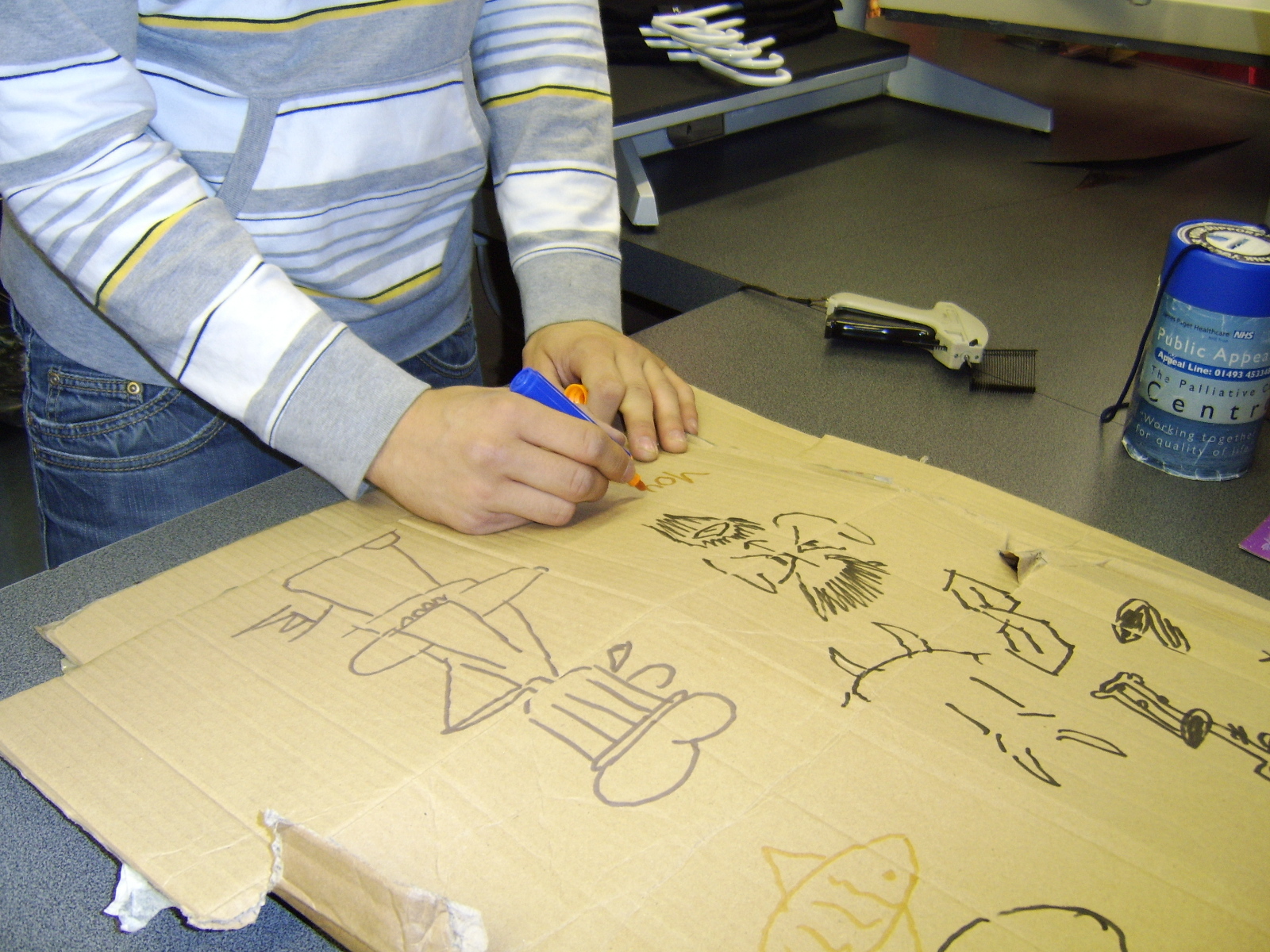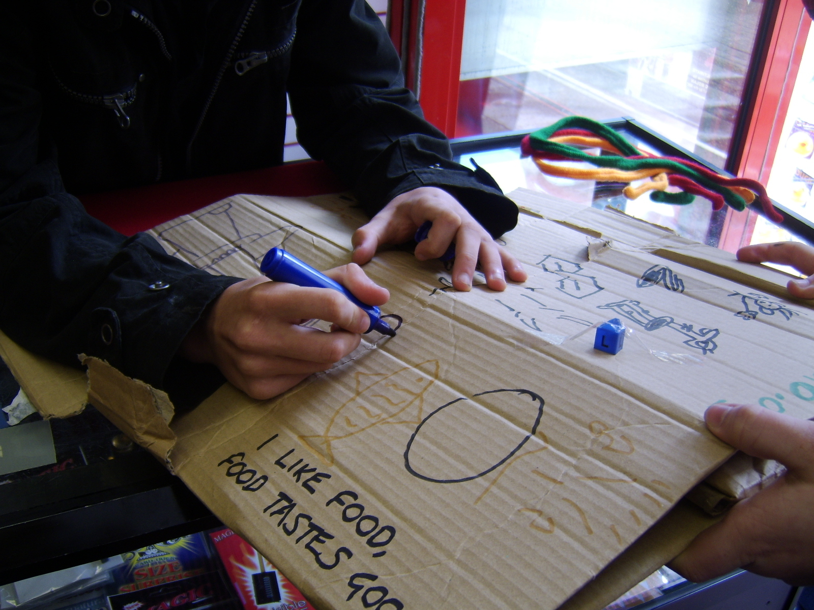 Once we had sucked the market dry of artistic urge, we made our way back down Regent Road. Getting a few doodles from bored passers by, we hit a few of the more interesting shops. We made our way into 'Dead Good' where we recieved our first dose of typical Great Yarmouth, having to censor much of it. However one of the more abstract employees taped a piece from a coat hanger to it.