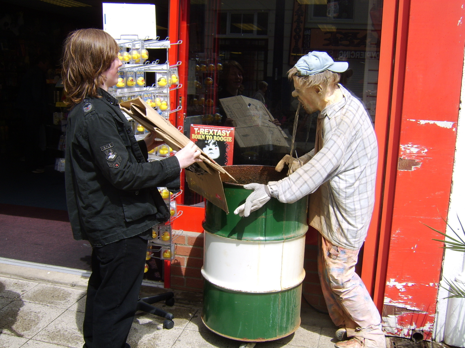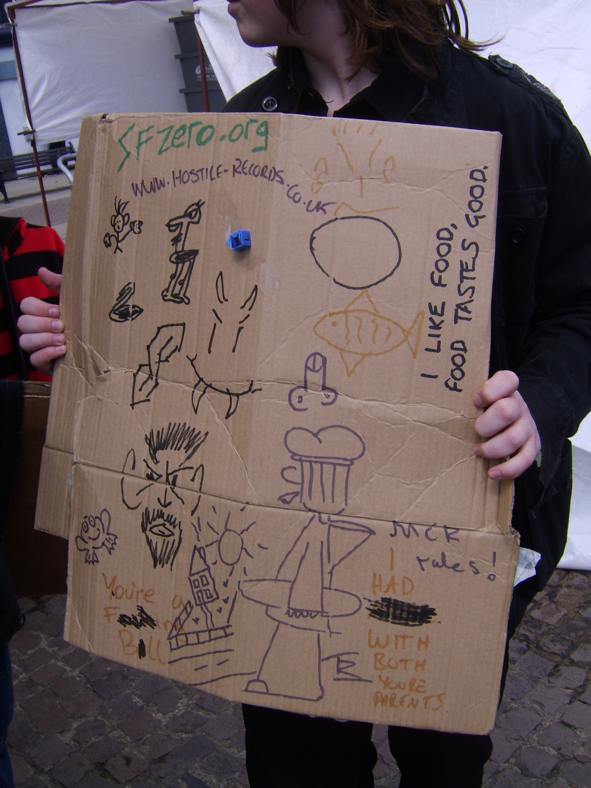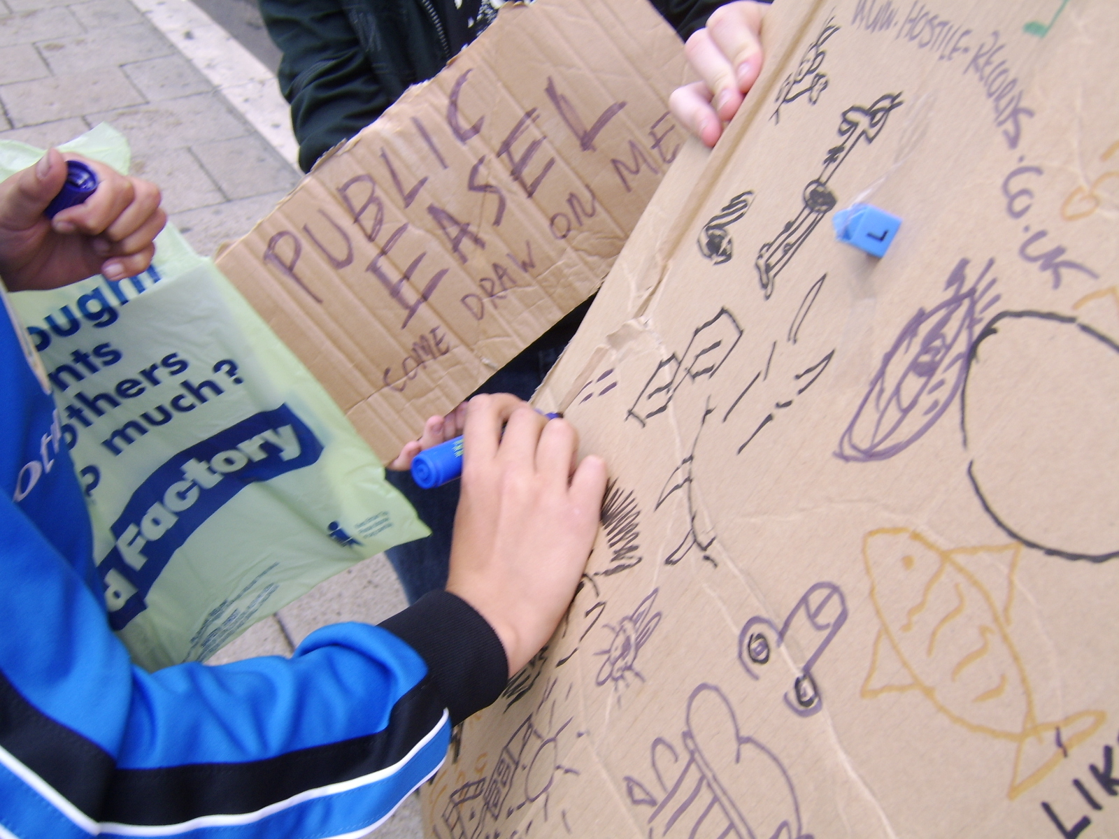 We were not put off though, and we continued up to the Great Yarmouth market, where market stall owners provided much of the piece, including the dragon to the right of it from Taz from Hostile-Records (which they decided to advertise on our easel).