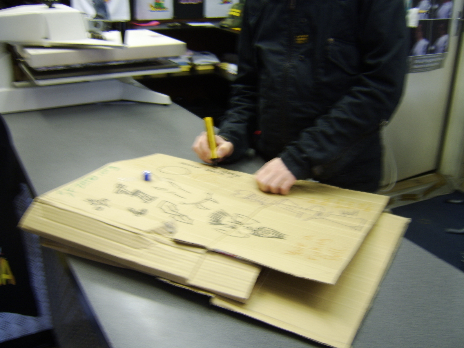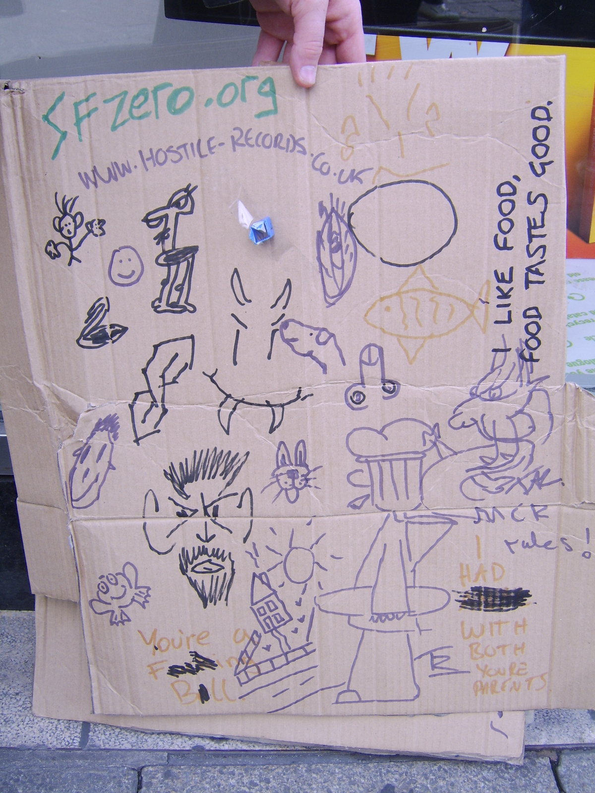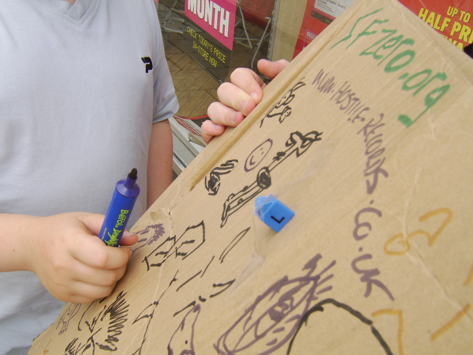 We were not put off though, and we continued up to the Great Yarmouth market, where market stall owners provided much of the piece, including the dragon to the right of it from Taz from Hostile-Records (which they decided to advertise on our easel).