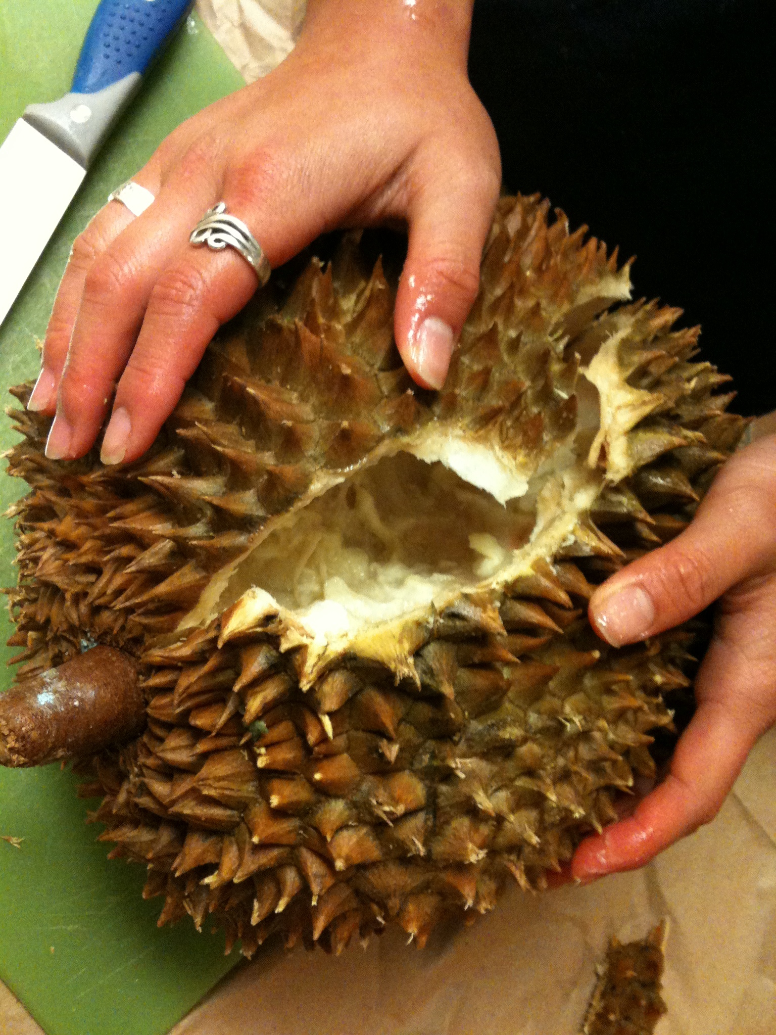 I was hoping nobody would notice my massive breach of durian safety protocol... Indeed, I failed to wear gloves.