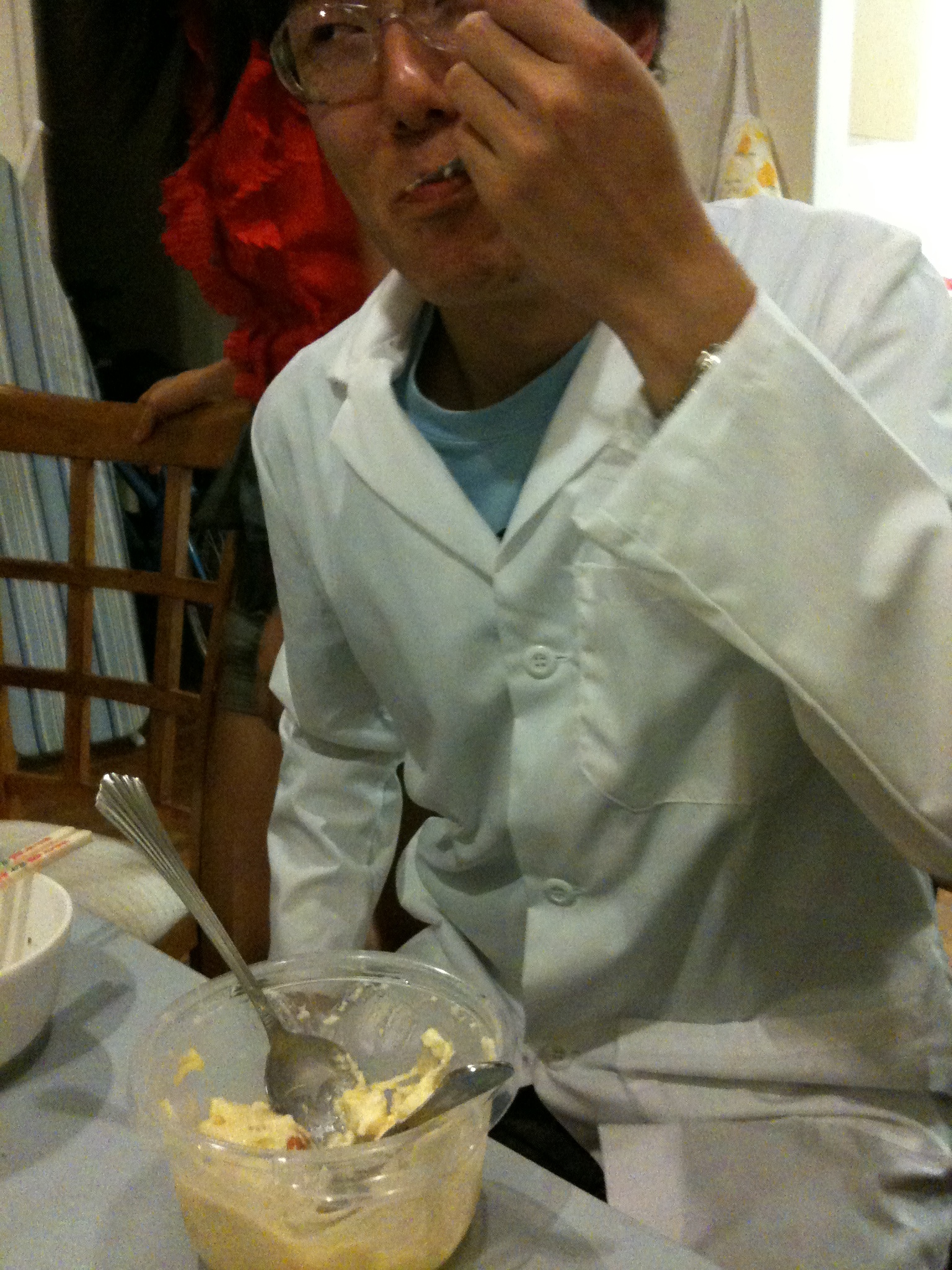 After beating on it with the butcher knife for about 15 minutes, we finally opened it up enough to get to the stuff inside: a gelatinous, whitish yellow goo. At this point the smell was an overpowering, enigmatic sweet and sour, and the people who live two whole floors above the kitchen came down to see what was causing the smell.
