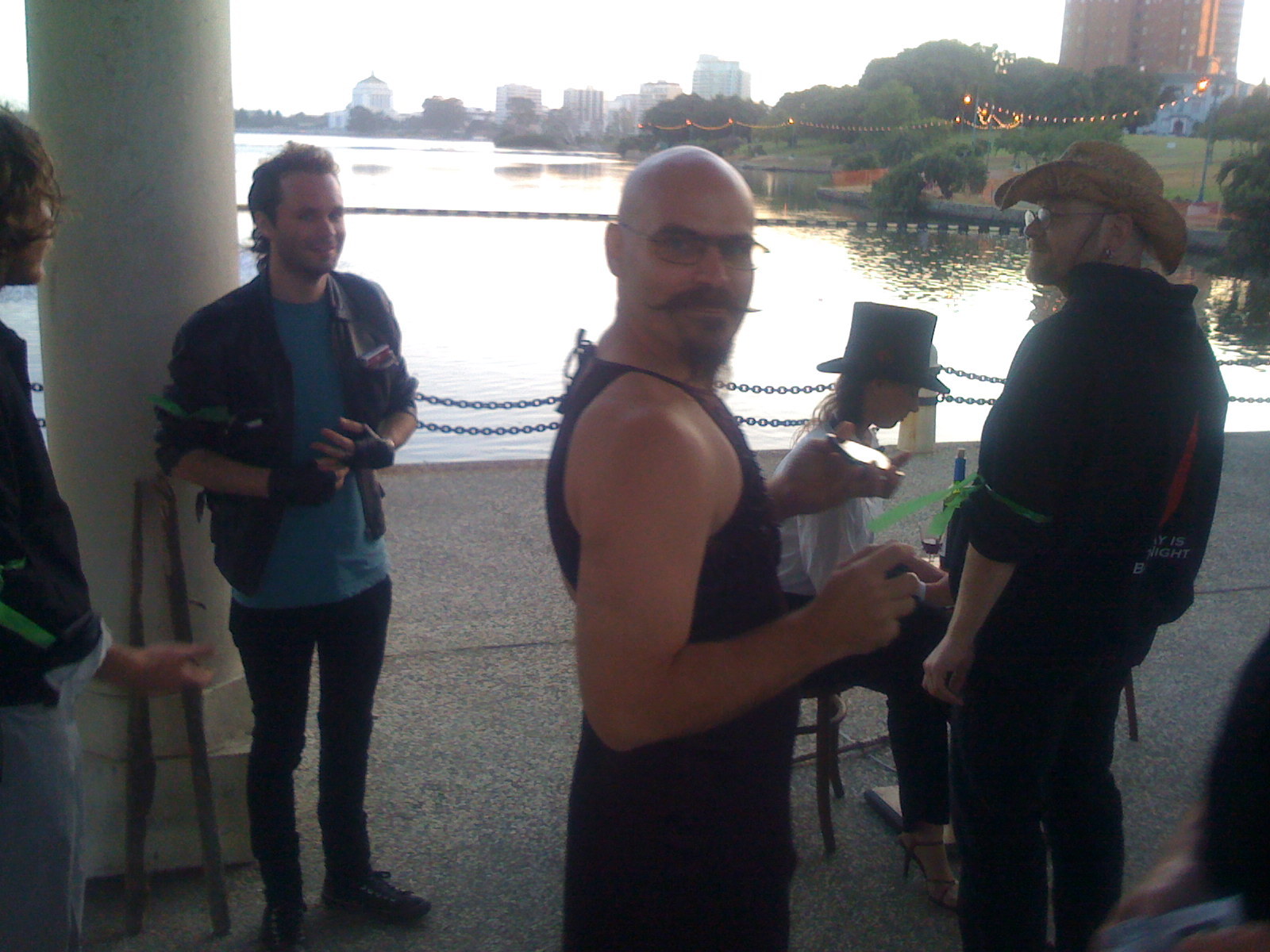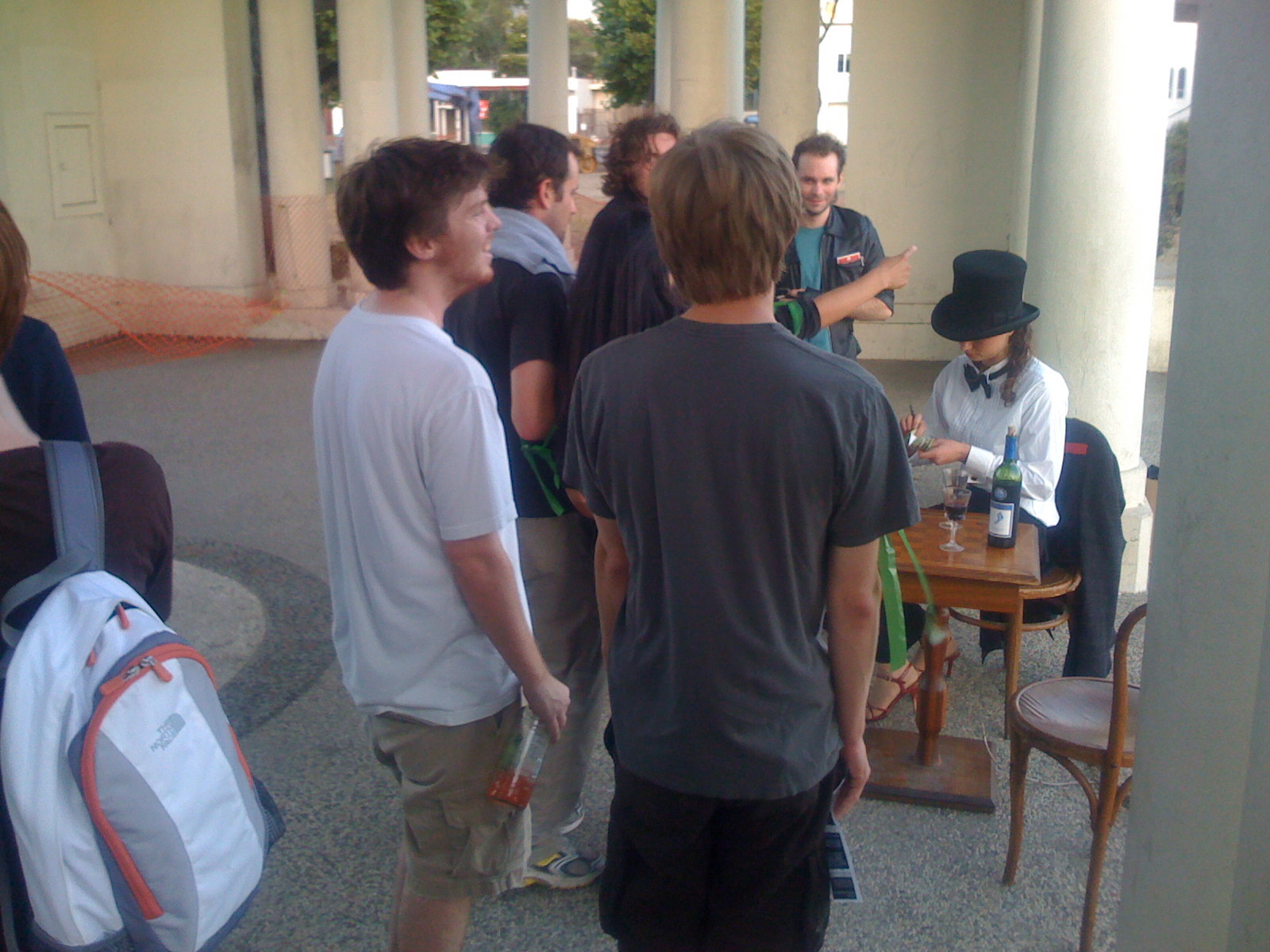 We met the Unlikely Fisherman, who recorded our names and images, and collected our signatures from a woman in a top hat. I considered asking if I could take a sip from the nearby wineglasses, but thought better of it. Next time I'll have to bring a flask. Anyway, the nearby area was already swarming with chasers. We set out a couple times and each time we made a quick retreat to the safety of the checkpoint. In desperation, we hatched a plan to go around the lake the long way, and headed out on a long journey that would take us past checkpoint four and then back to three.