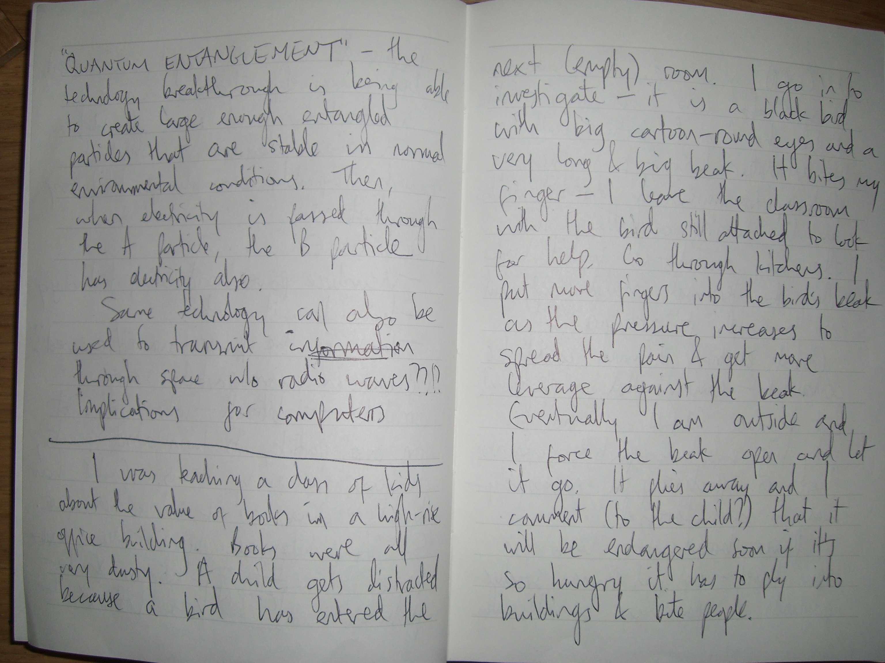 I had this dream after reading up on quantum entanglement (previously my brain was referring to entangled particles as "twin particles"). There's also a very random dream I had about a big-beaked bird with cartoon eyes.