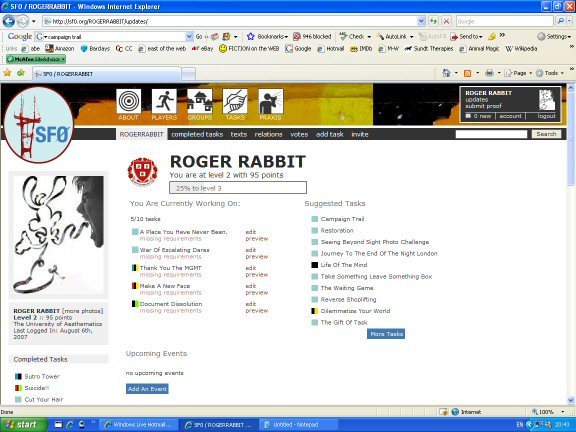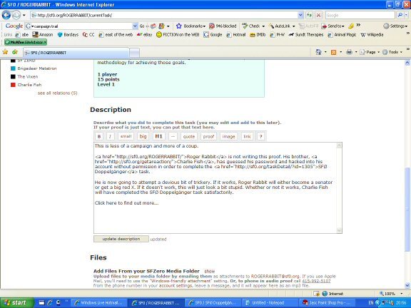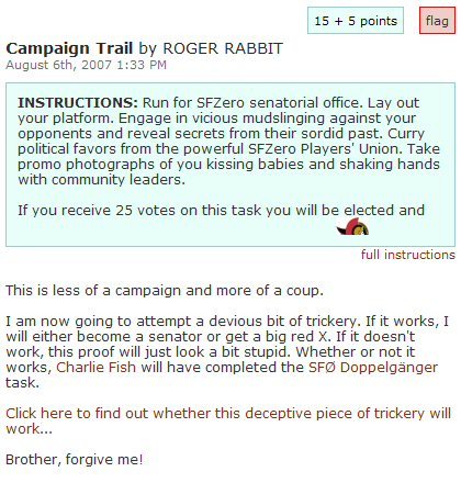 The task I chose was Campaign Trail. Which means that Roger Rabbit is now running for senator (although he doesn't know it yet). Who knows, he might even win, then hopefully he'll forgive me for hacking into his account!