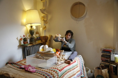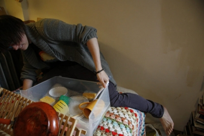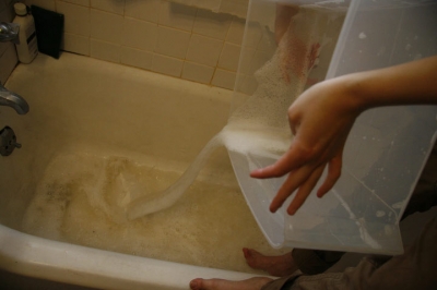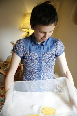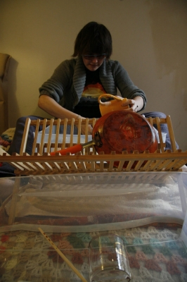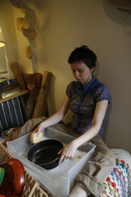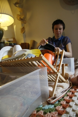 using old plastic drawers for the basins, we filled them with water (one sudsy, the other fresh) and placed them beside a drying rack on her bed. we then proceeded to...wash the dishes in bed!