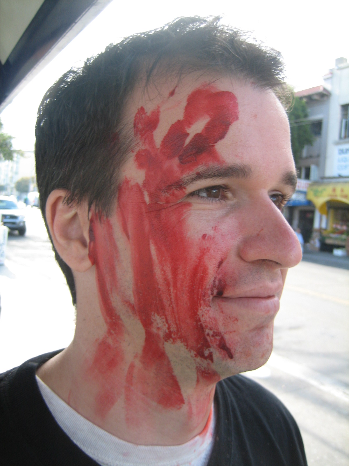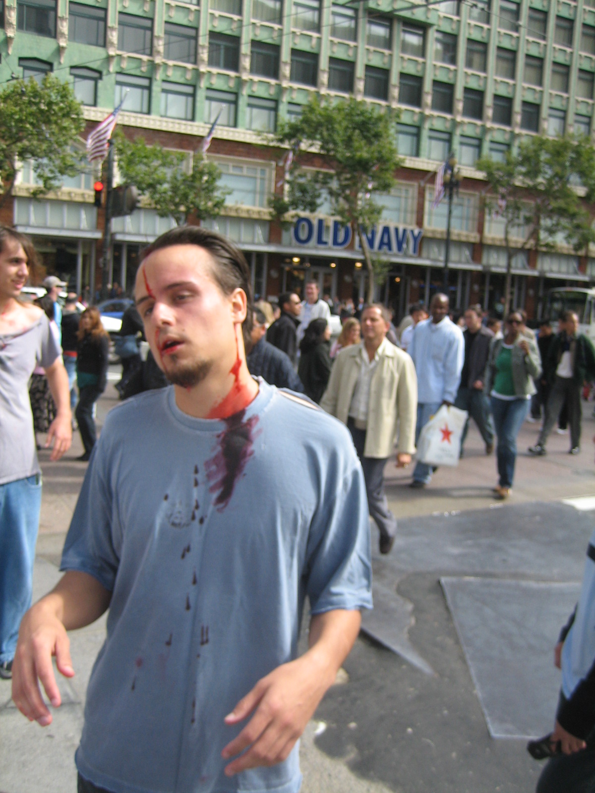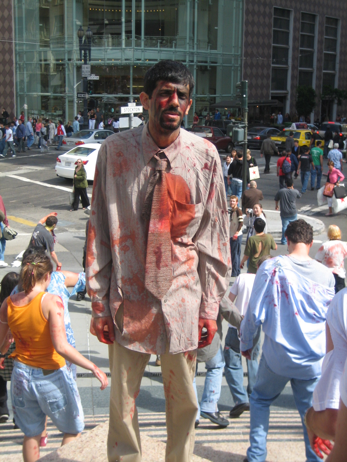 During Avidd's Event AKA The Zombie Mob, we came to the corner of Ofarrell and Powell, just a block from Union Square and the mob (such a well behaved mob) was stopped for a traffic light. A police office came up to the front of the group and started trying to ask zombies questions about what was going on. Unfortunately he chose several of the "farther gone" zombies and they simplyu stared and muttered about lucious lucious brains. He asked several times, eventually asking if there was some kind of "Zombie-In-Charge" that he could talk to. The ones father up said nothing, clearly fixated on his bald head and wondering if they could get in there before he drew his weapon. Only having been a zombie for a block or two, I had a moment of clarity and stepped forward. I said, "You can talk to me." He asked if what was going on and if we were part of some kind of event, and where we were going. I told him as much as my recently emptied skull could recall, though I was merely a victim rather than a mastermind and had little information for him. He warned me that they might not like us up in Union Square, but was distracted by a zombie wielding a beer that was poorly concealed by its paperbag. Apparently, zombies aren't allowed to drink in this city! He was extremely polite, though I imagine he knew he was outnumber and was probably terrified.