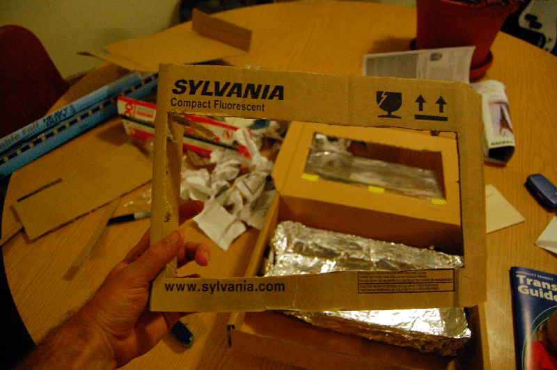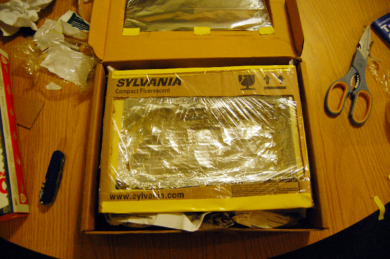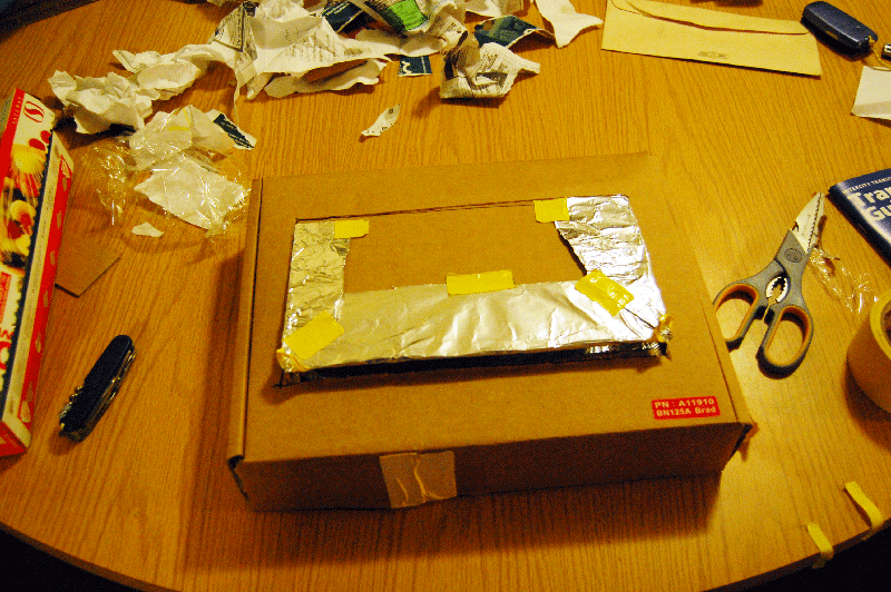 Cut a flap the same size of the Warmification Chamber in the lid of the larger box, and coat the inside with foil.