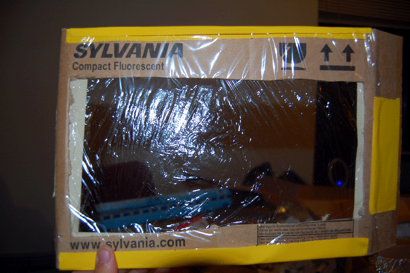Cut a hole in the spare cardboard piece -- again, the same size as the Warmification Chamber.