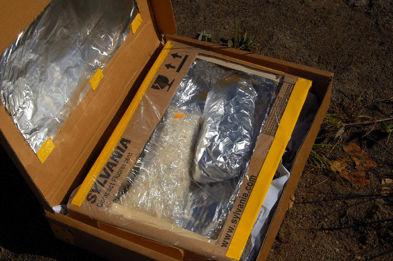 Two experimental subjects were included in this initial test run: a burrito wrapped in clear cellophane, and a burrito wrapped in aluminum foil. Here they are within the Primary Warmification Chamber