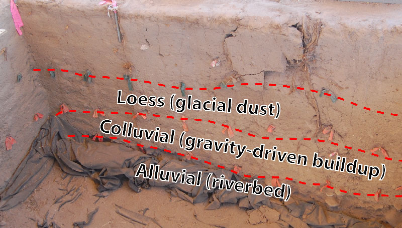 Fig. 1: The [redacted] Creek Dig SiteThe main focus of the excavation is within the colluvial deposits that built up over the site of a pre-glacial riverbed, and which were in turn buried by loess produced by glaciation during the last ice age. Radiocarbon dating of bone samples, as well as infrared-stimulated luminescence of the surrounding stratum confirm an age of roughly 16,000 years before present for the colluvial layer.