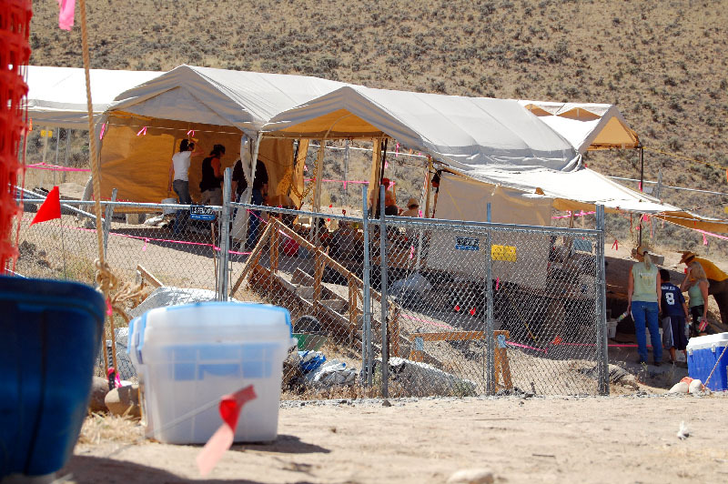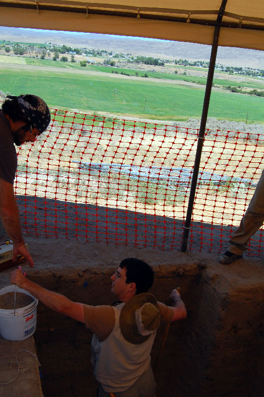 The soil is sifted through fine screens, looking for any small bones or other artifacts that are easy to miss when you're shoveling. 95% of it goes through a 1/8" mesh, and the remaining 5% goes through a 1mm mesh. After it's sifted, the soil either blows away, or accumulates in a pile -- but either way it's still private property. Since human artifacts were found at this site, it's under much stricter regulatory controls than if it was just mammoth bones. I didn't steal any of the soil -- but since it's so light and powdery, a fair amount of it did wind up in my hair, up my nose, and in my camera bag!