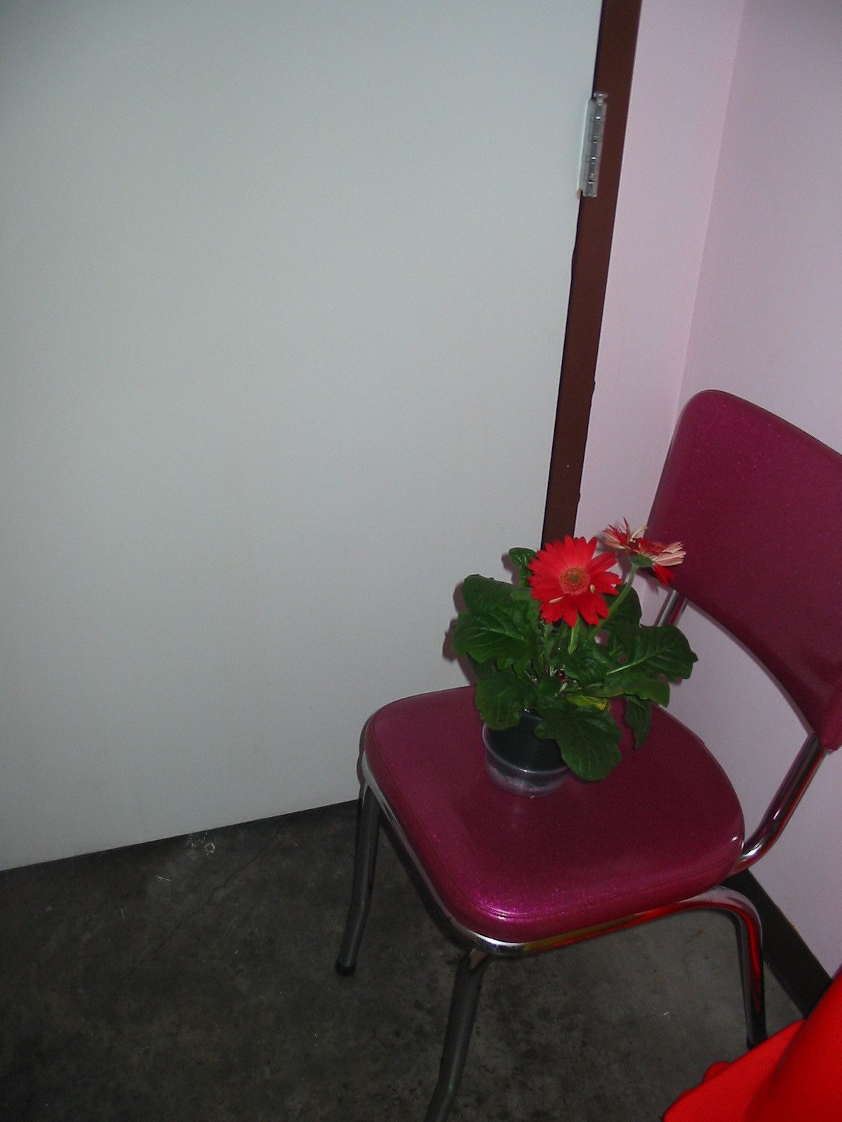I saw this task and thought "What place around me deserves a potted plant?" Immediately Sticky Fingers, the vegan bakery here in DC, came to mind. Sticky Fingers helped me survive my last bit of grad school when I was too busy to cook. I rarely go there anymore since I can cook better for myself and I really don't need a cupcake most days, but I thought I'd bring this little bit of sunshine in caloric thanks. Their space is an ultra mod-diner type of an atmosphere and up until recently they didn't even have any decorations on the wall. Certainly not a green thing to be found.