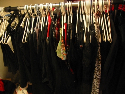 Notice what isn't there? Yeah, a whole lot of colour. From left to right the things that aren't black include a purple plaid skirt (cuz I have a plaid skirt fetish), a red button down sleeveless shirt that goes well with my various gothabilly skirts. A girl scout uniform for theoretical role playing. A black/white/red plaid skirt. The two things with actual colour (the light green and the brown w/ orange and teal dresses) are vintage dresses and don't count. A red skin tight chinese style dress. And, although you can't see them, there are two pink and black rockabilly and fetishy halter dresses. Also notice the lack of pants. I do own several pairs, however I almost never ever wear them.