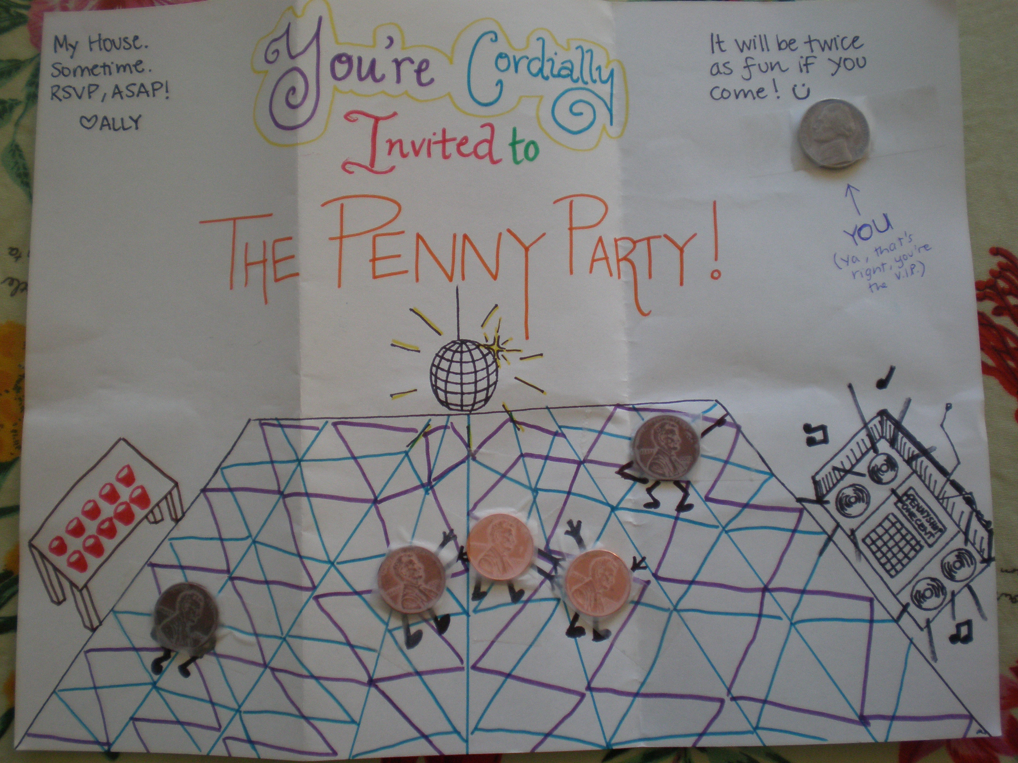 So I realized that few things are sent via snail mail these days, but traditionally, formal invitations still are. Because of that, I decided to invite my dear friend Stuart to a very special gathering. It is called the Penny Party. I postulate that he will come to my house and we will discuss the importance and brilliance of the penny and what it represents (if we have time) but mostly just focus on the party aspect of this alliterative get-together. I put a decent amount of time and relative money (between the coins and double postage, these things add up), all for a mere point, but the best I can hope for is that Stuart enjoys receiving this as much as I enjoyed preparing and sending it. Plus, he is represented by the nickel in the upper right-hand corner, which means he is the most valuable guest (literally), so I hope he can see just how special he and Abraham Lincoln are to me.