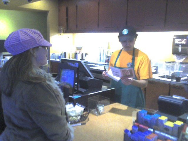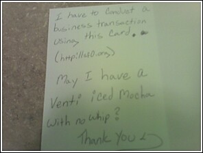 I ordered a coffee using a greeting card I found in my filing cabinet. I chose to combine this task with "nice to meet you," and gave my sealed card to the barista when he gave me my coffee. He was really swell, and seemed surprised and thankful when I gave him the little note.