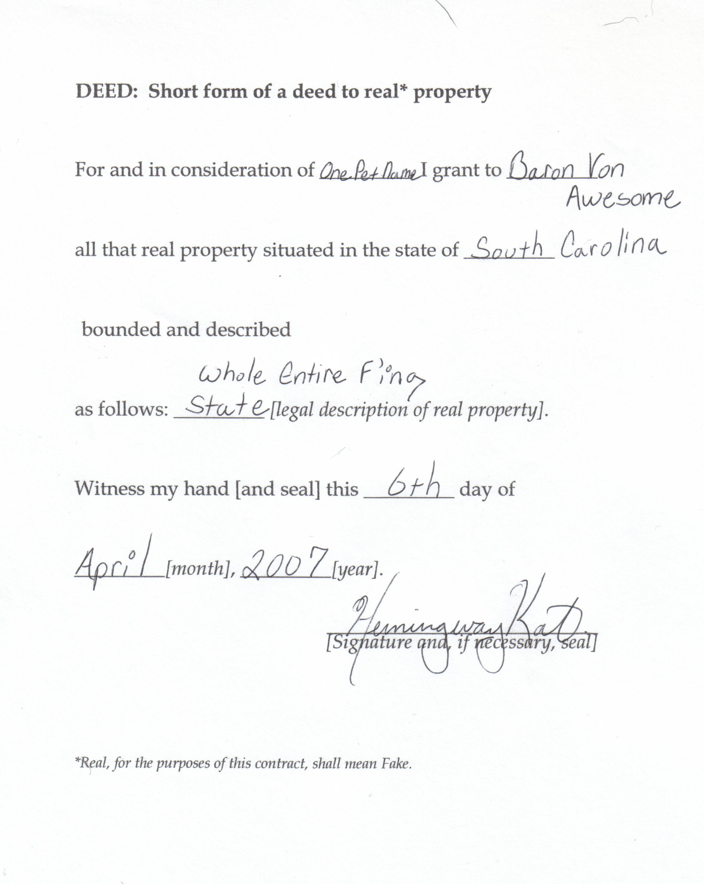 I chose to deed the entire state of South Carolina to Baron Von Awesome, because he asked me to. He does so much for us, and really never asks anything in return, so what's a southern state between friends?