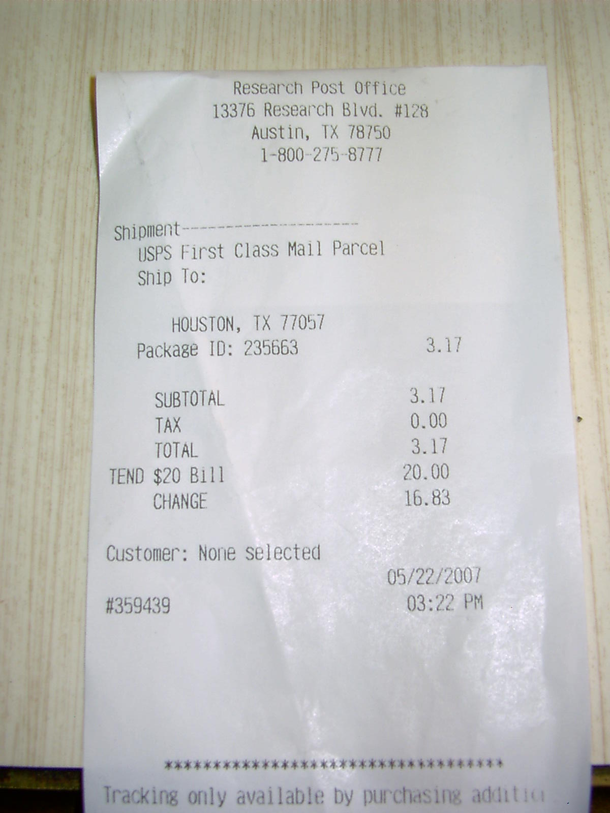 A reciept from the post office. Considering the climate, and the fact that I live in Williamson County, sorry, there was no way I was going to stand around photographing a post office.