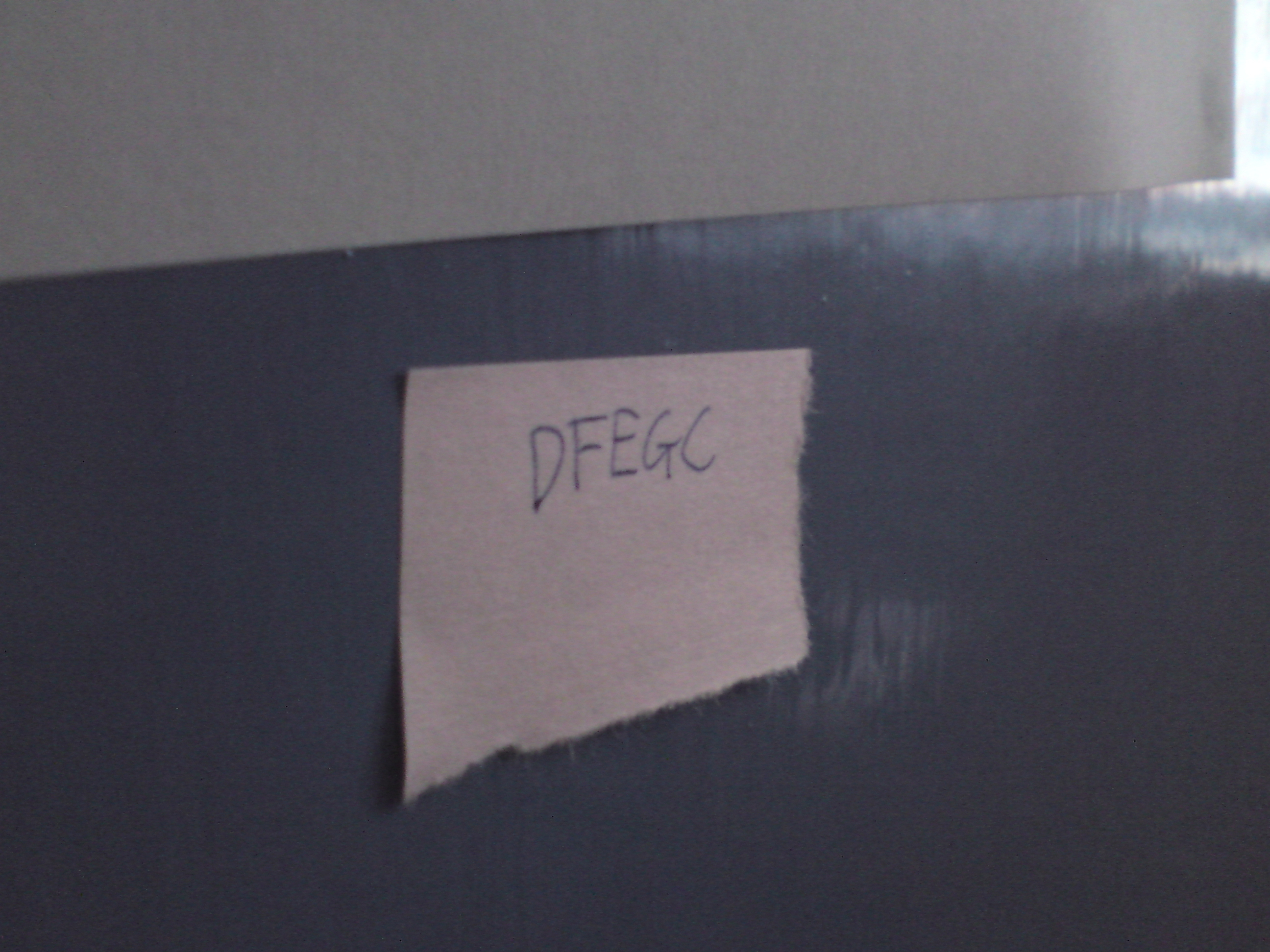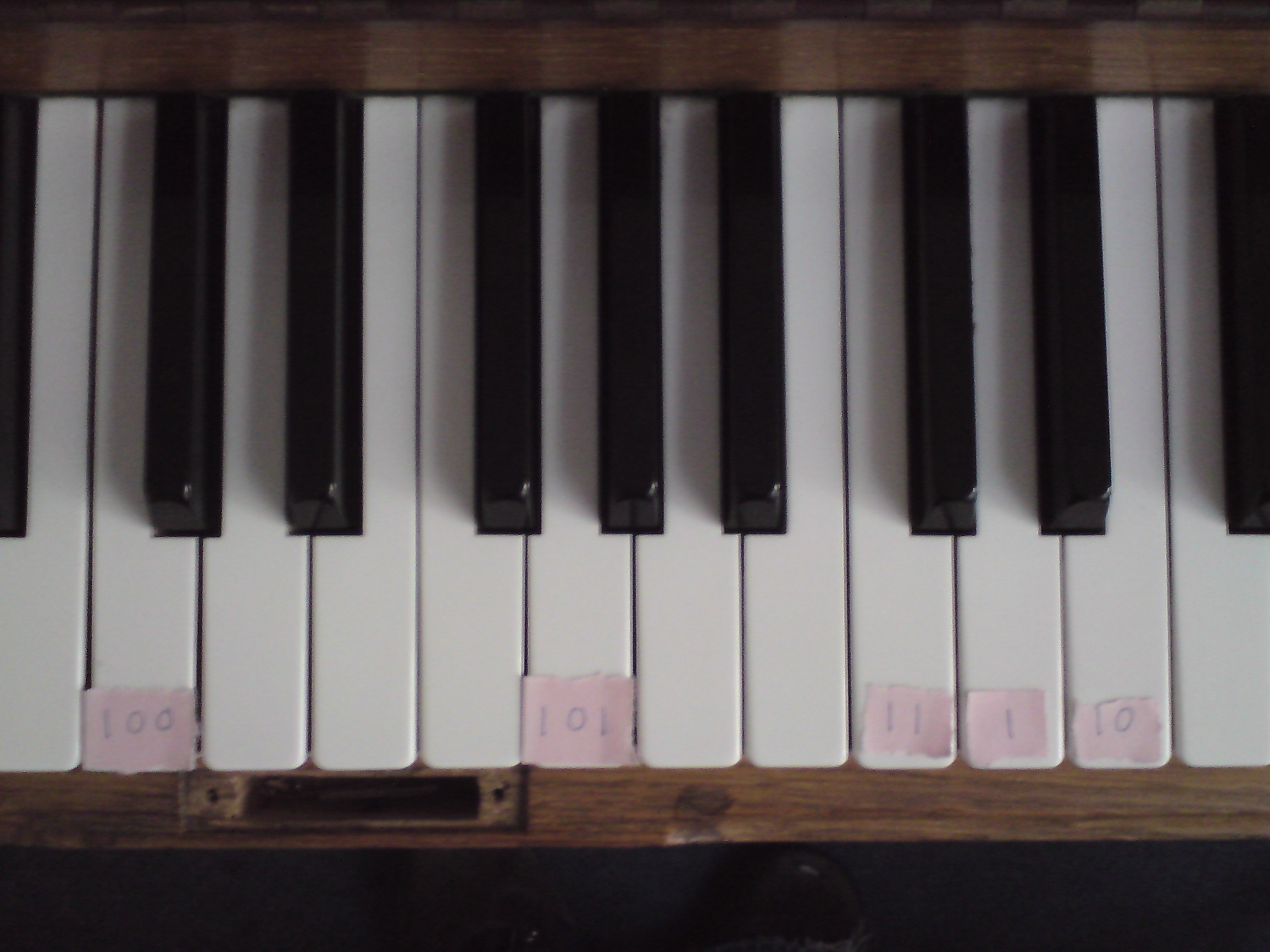 So the form, I decided, had to give access straight to the musical element of my secret message. I thought about writing the notes out as a word, but that seemed just too easy. Of course I didn't want it to be tough, but giving it straight to them without any work whatsoever seemed empty and worthless. I needed to combine easy access to the musicality of it with an element of puzzle, so I decided to give the order of the notes in binary, with that order stuck onto the keys as post-its.