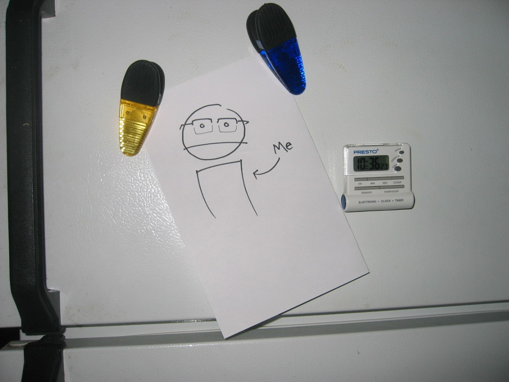 Proudly displayed in the only suitable location for fine art. I was able to borrow a digital camera, but unfortunately, I was unable to locate any crayons (or artistic ability).