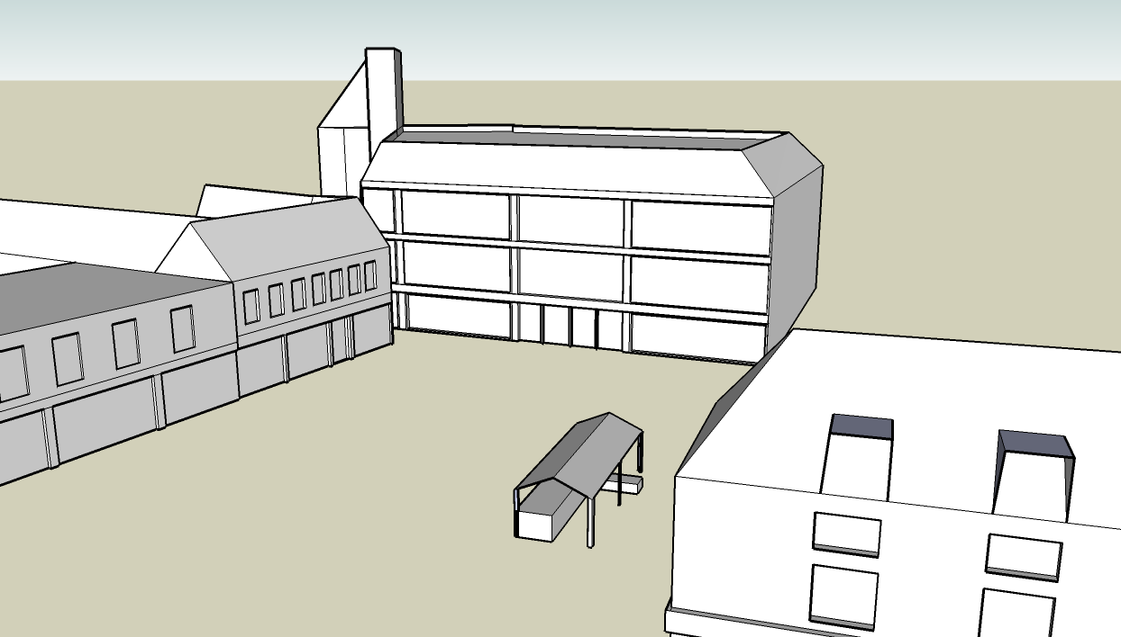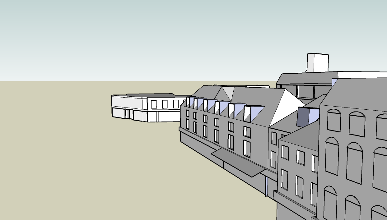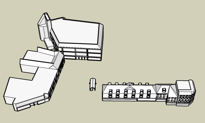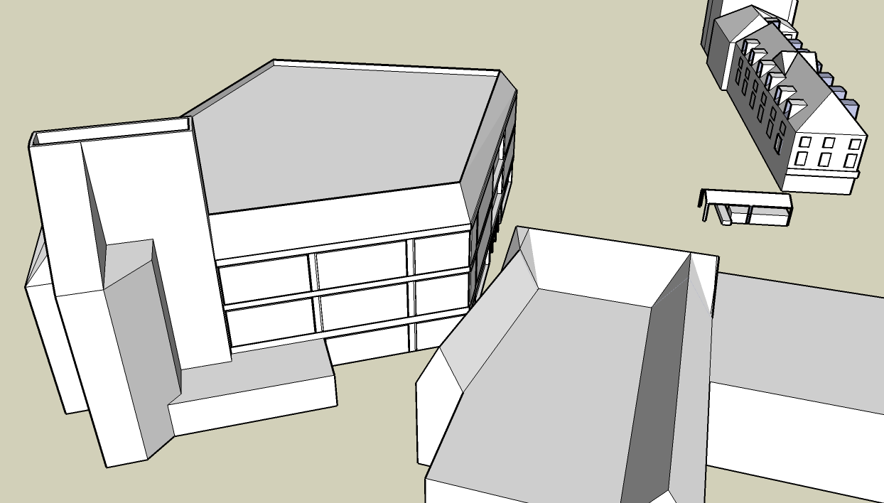 To recreate this I begun by taking a screenshot of the area and pasting it into Sketchup and then used the tools there to first create an outline of the areas and then build them up to be fairly realistic copies. It is the first time I have ever used Sketchup and it is quite a simple programme. I think I did quite a good job at recreating the area.