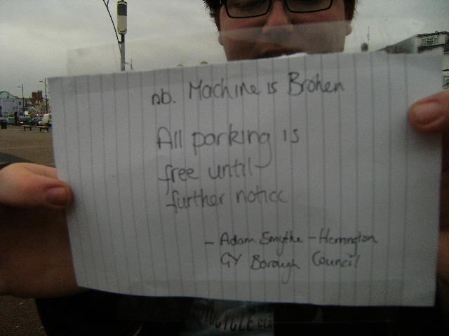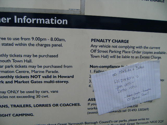 December 31st, 2007 12:07 PMFirst of all, we replaced a car park sign informing people of costs with a late Christmas present to Yarmouth, free parking!