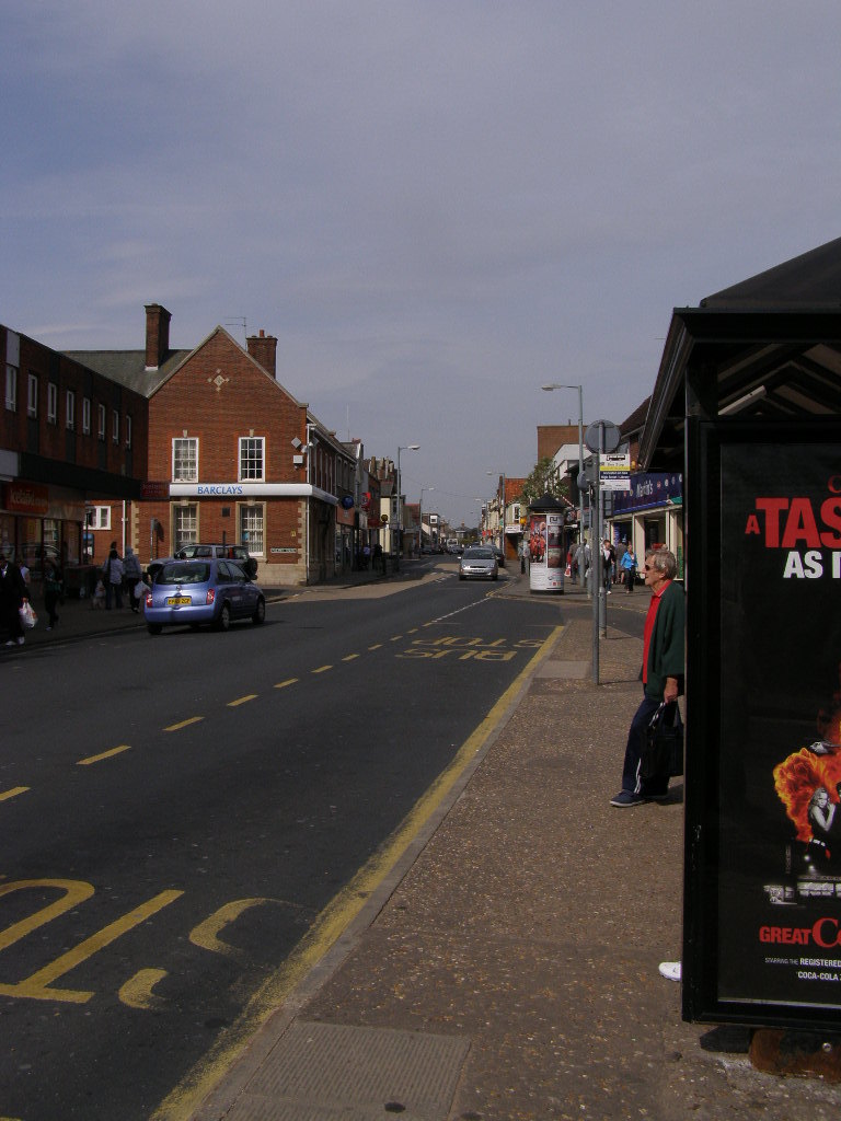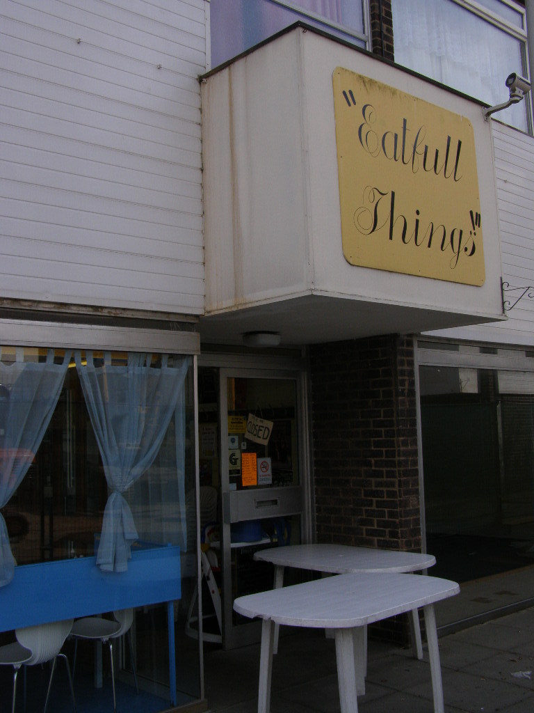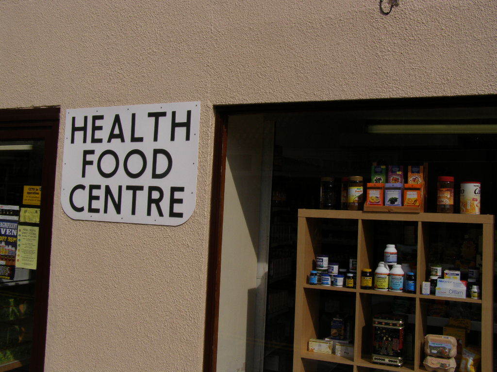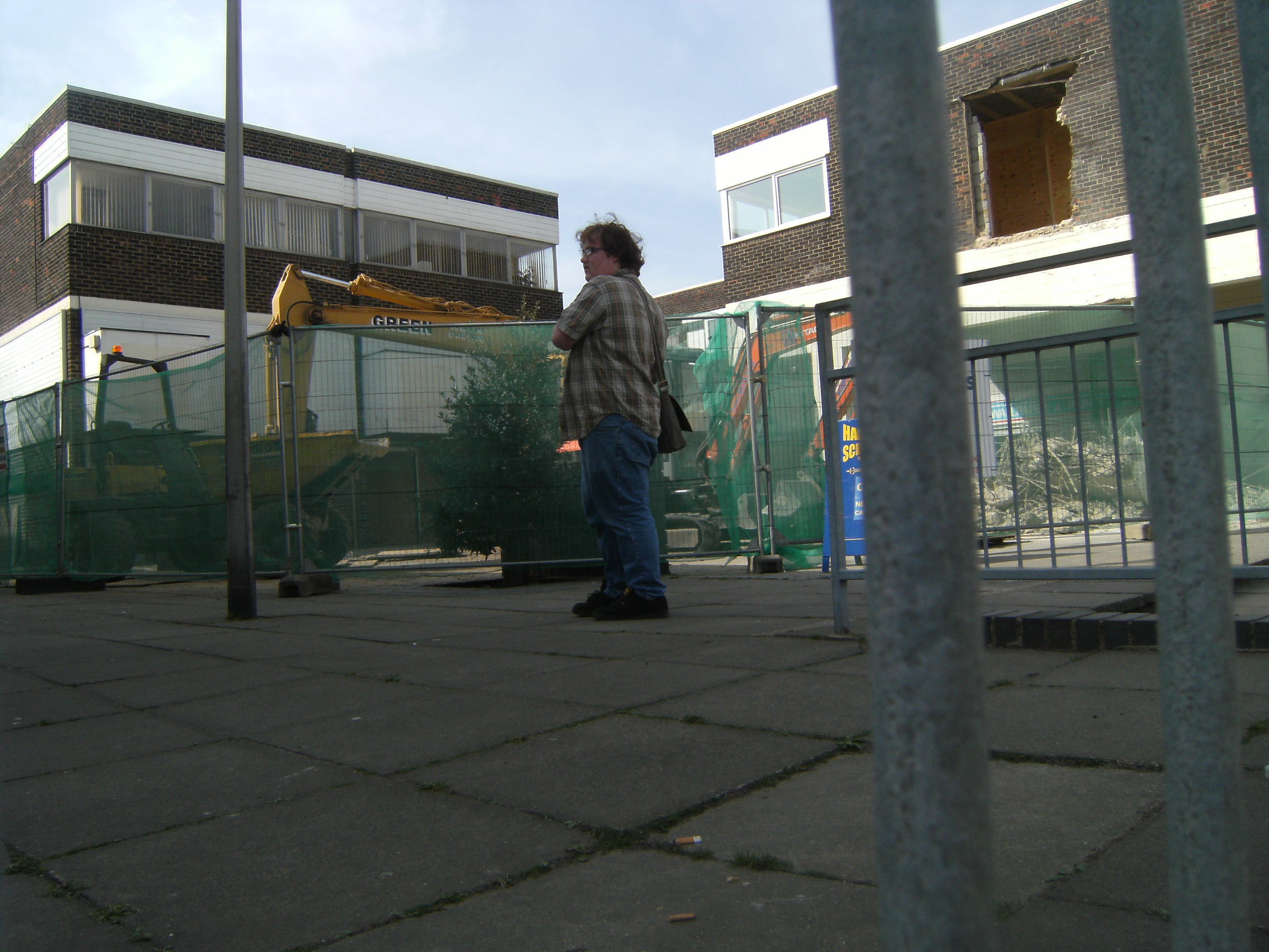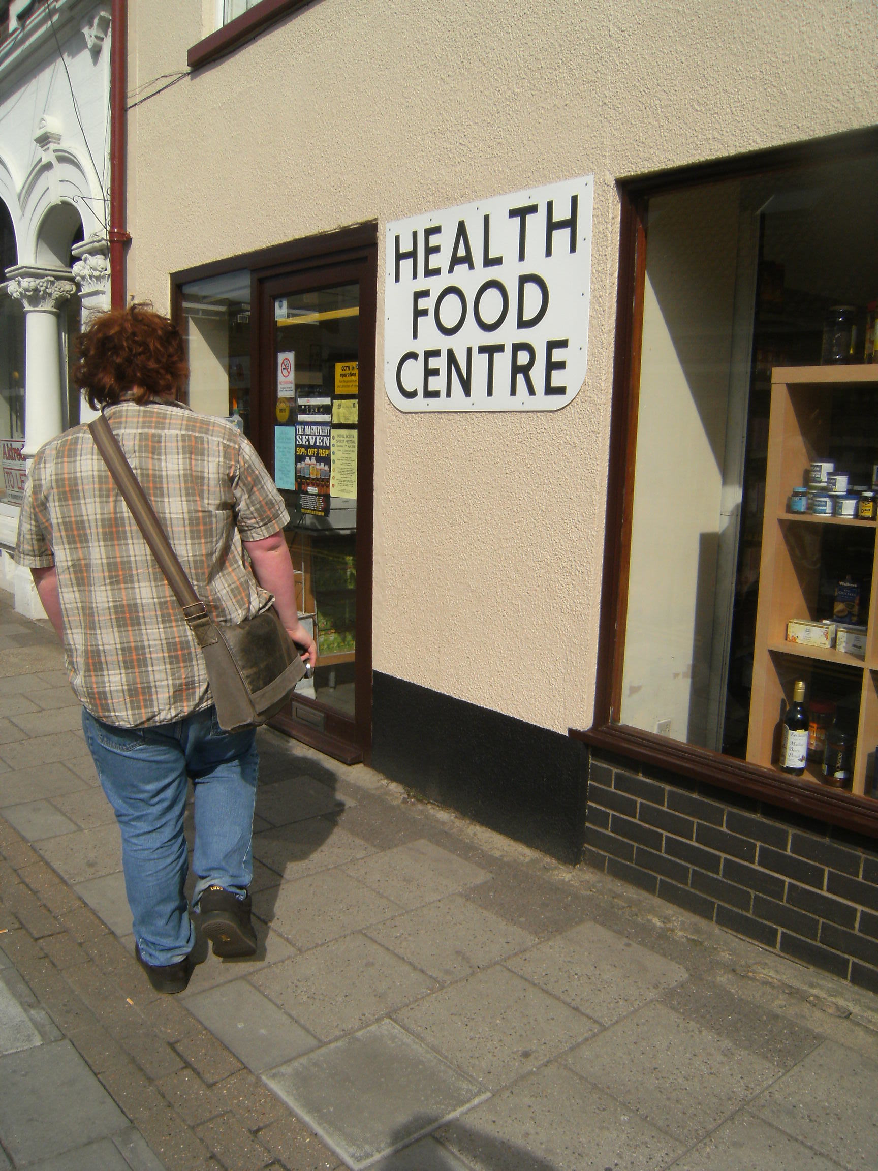 Where once was Somerfield, will soon be Morrisons.Now we are stood in a carpark. Miserable as fuck and boring to boot. So we walk away from the trees and up a hill, I hate hills, hills are the enemy of the fat. I like looking at them but I hate climbing them. We proceeded anyway and back onto the high street and then up it. Towards QD, a store I hate and then the worst thing we could have seen. "Health Food Centre". Given the nature of this task this store had "Reversed-Polarity Derive" written all over it. Once we had seen the horrors of this awful, awful place we went onwards to the rather grandly named "Precinct". It isn't a precinct, it's not even anything like it. It's a clothes shop and a cafe. This is somewhere neither of us had been, or even wanted to go, before and so we moved swiftly on, through a car park and ended up doing a circle and ending up at a bus stop again.
