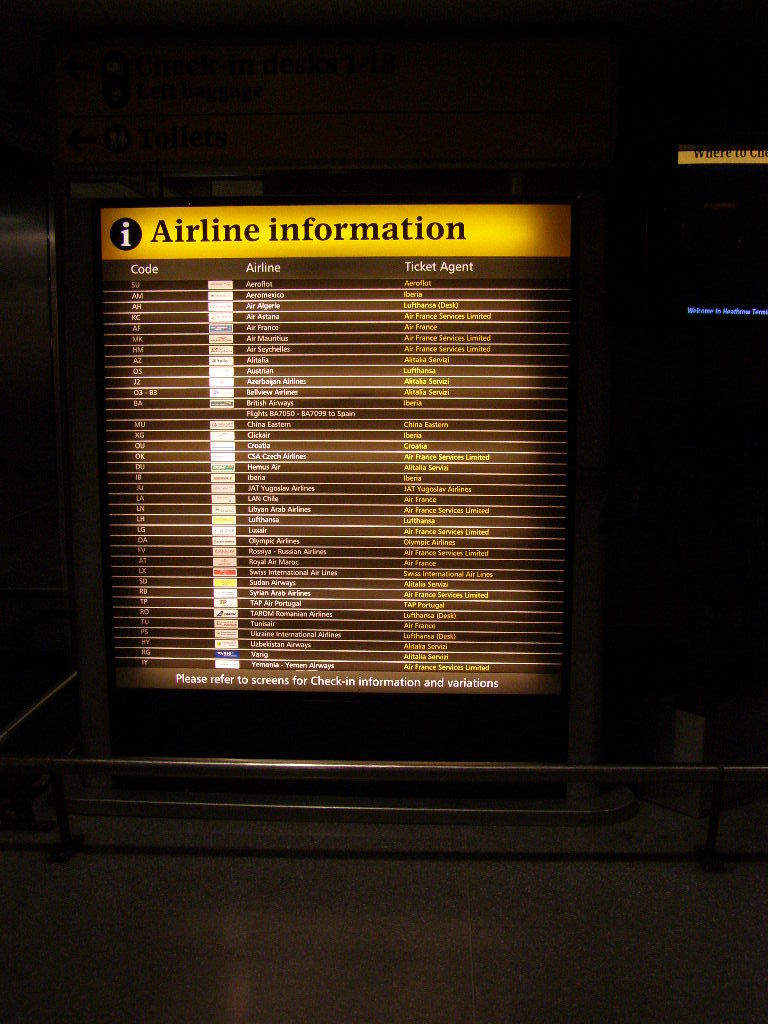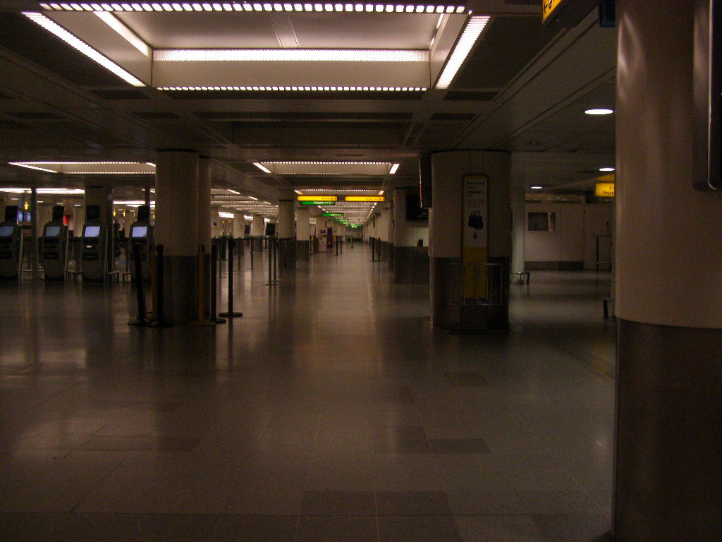 An airport at night is a very odd place, it is quiet and empty but it bears all the halmarks of somewhere ready to deal with large crowds. There are check-in desks, que barriers, information screens, benches and lots of signs but no-one there to use them. I went upstairs, sat in Costa Coffee and slept for a few hours.