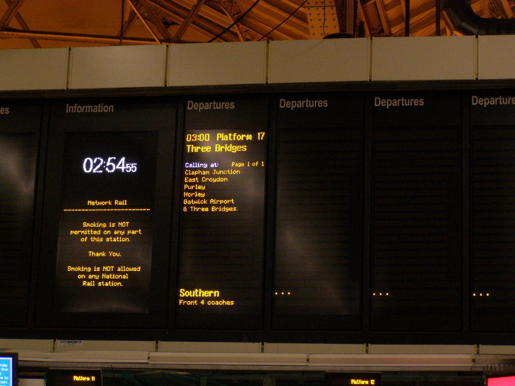 I then got a night bus from Heathrow, through South-West London to Charing Cross and then walked down the Embankment, past Parliament, across Parliament Square and caught another night bus to Victoria Station, I don't know why I chose Victoria but I knew it was the first terminus to open. It did so at 2:30 for the 3:00 Three Bridges.