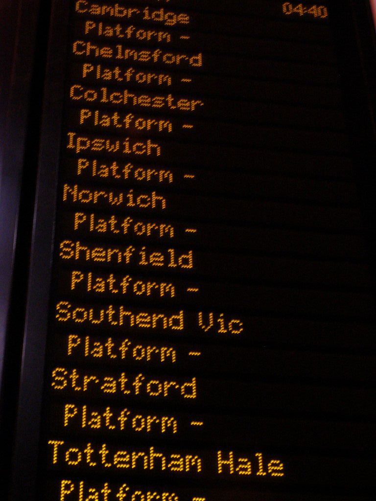 It was 18:15 at Norwich Railway Station and I jumped off the Great Yarmouth train on an impulse and got on the 18:30 service to London. I arrived at about 20:30 at Liverpool Street, had some dinner and went to Heathrow Airport to get some sleep.