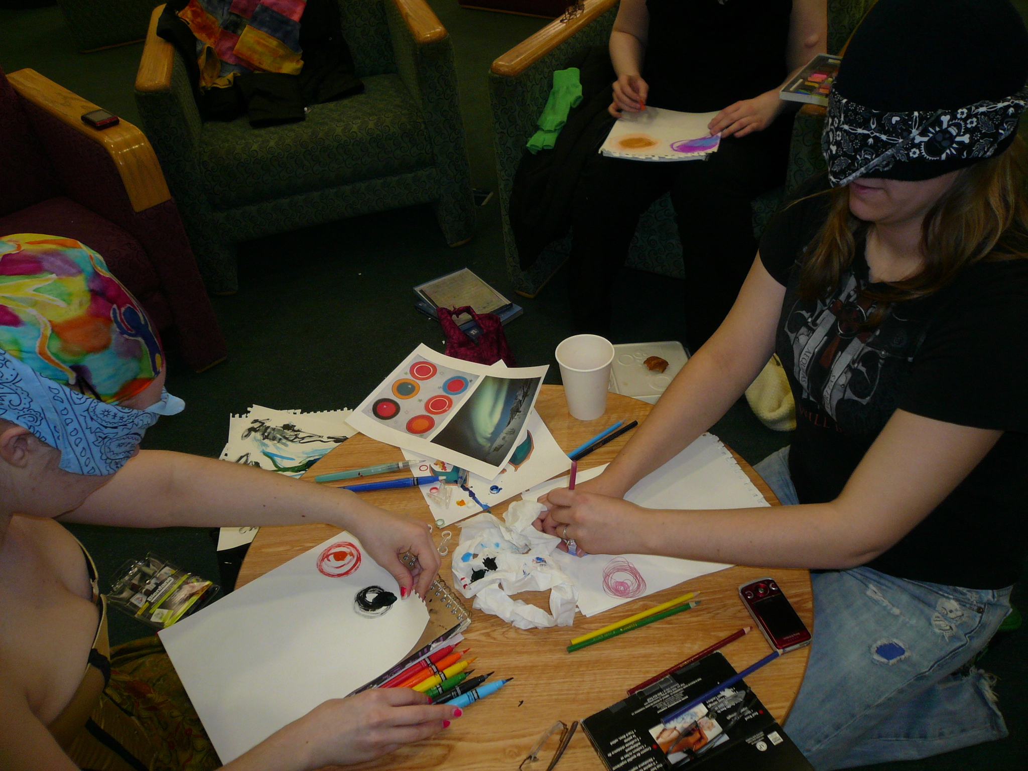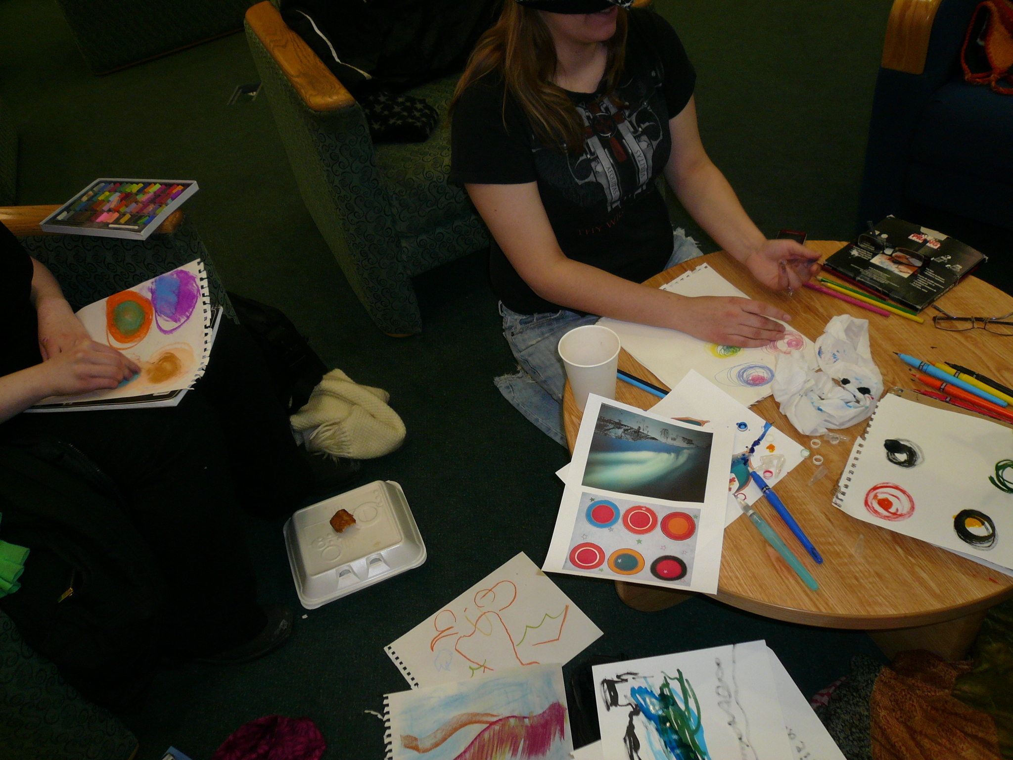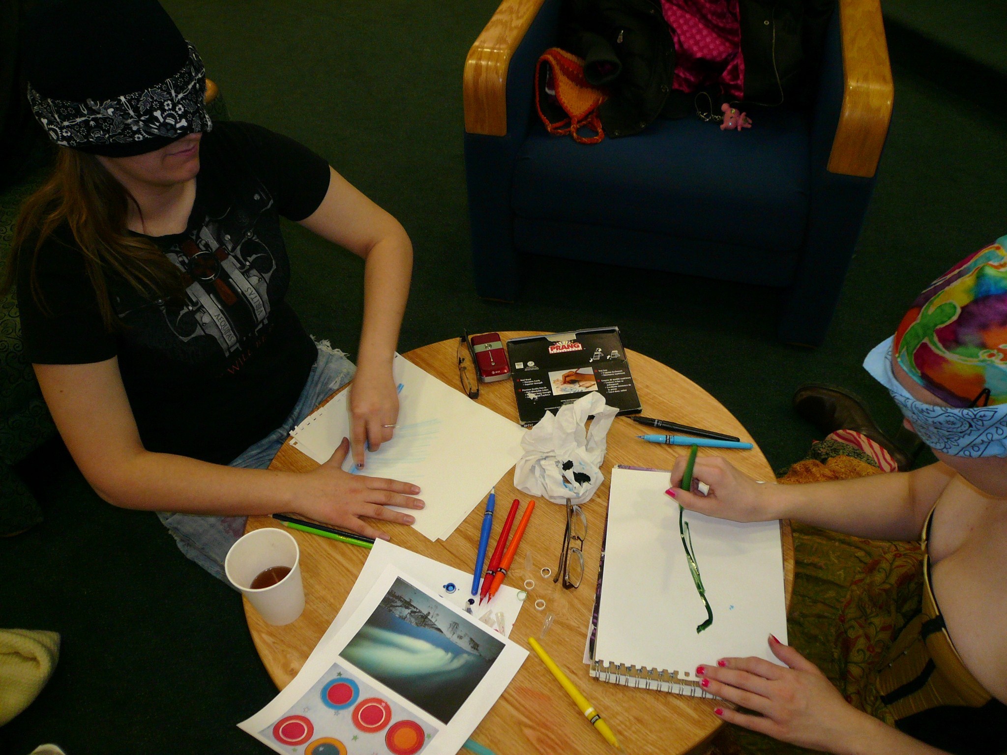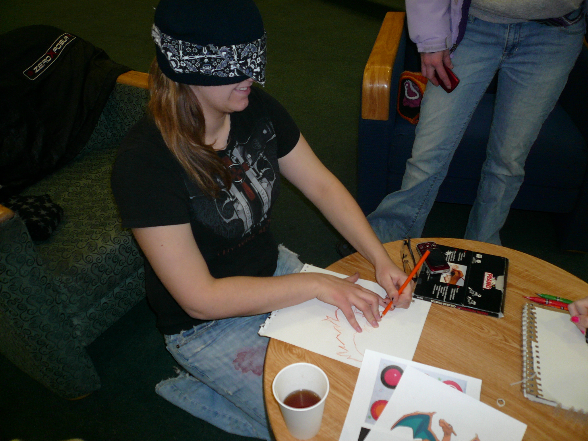 ANYHOO, There were three rounds, each with us attempting to recreate a different picture. Mary-Clare used coloured pencils, Rin used chalk pastels, and I used watercolour pens (which made a HUGE mess). We were all blindfolded and given 3 minutes to draw our pictures. At one point, a woodcenter staff member came over to ask if any of us was using paint, because we weren't allowed to be blindfolded if we were. Christine, like a good task assistant, lied and said we weren't painting. As I painted. And the lady believed her and left us alone. So HA!