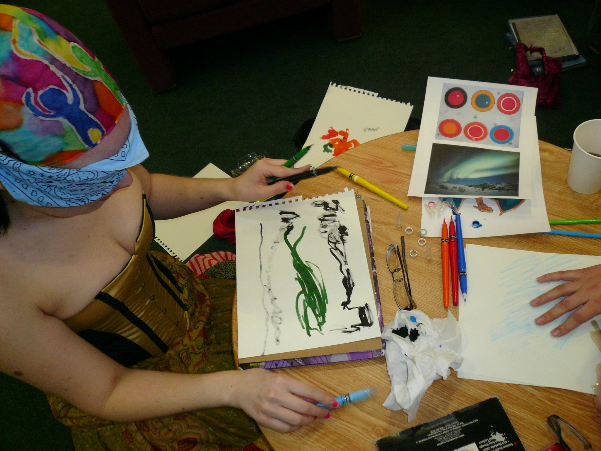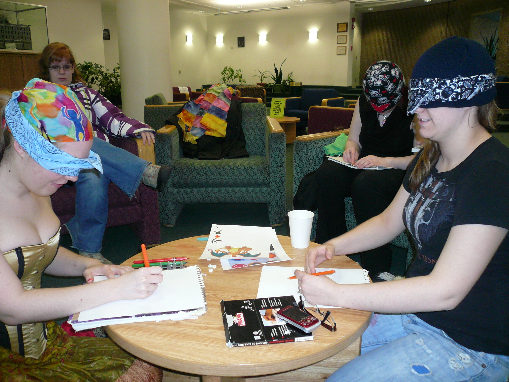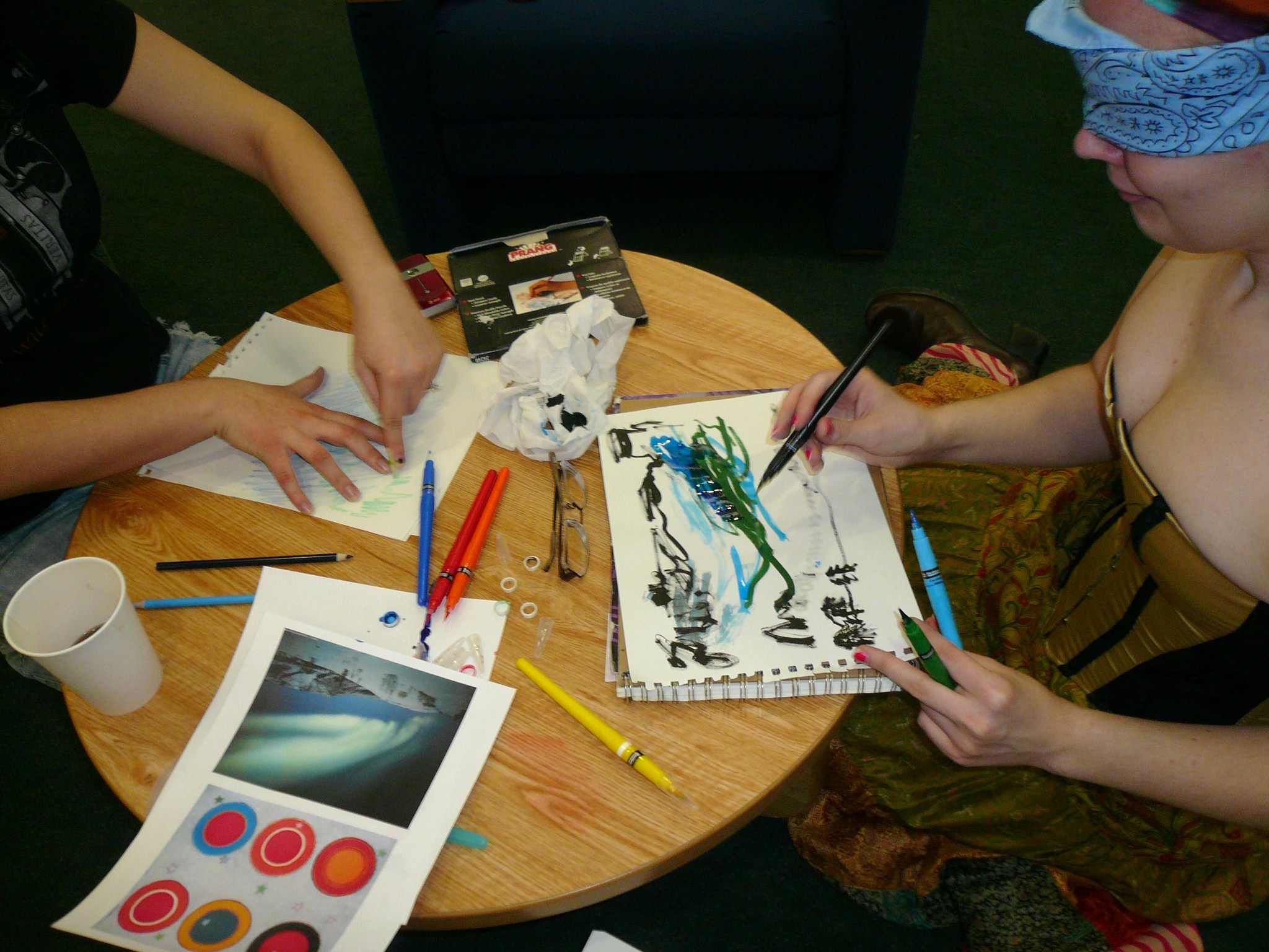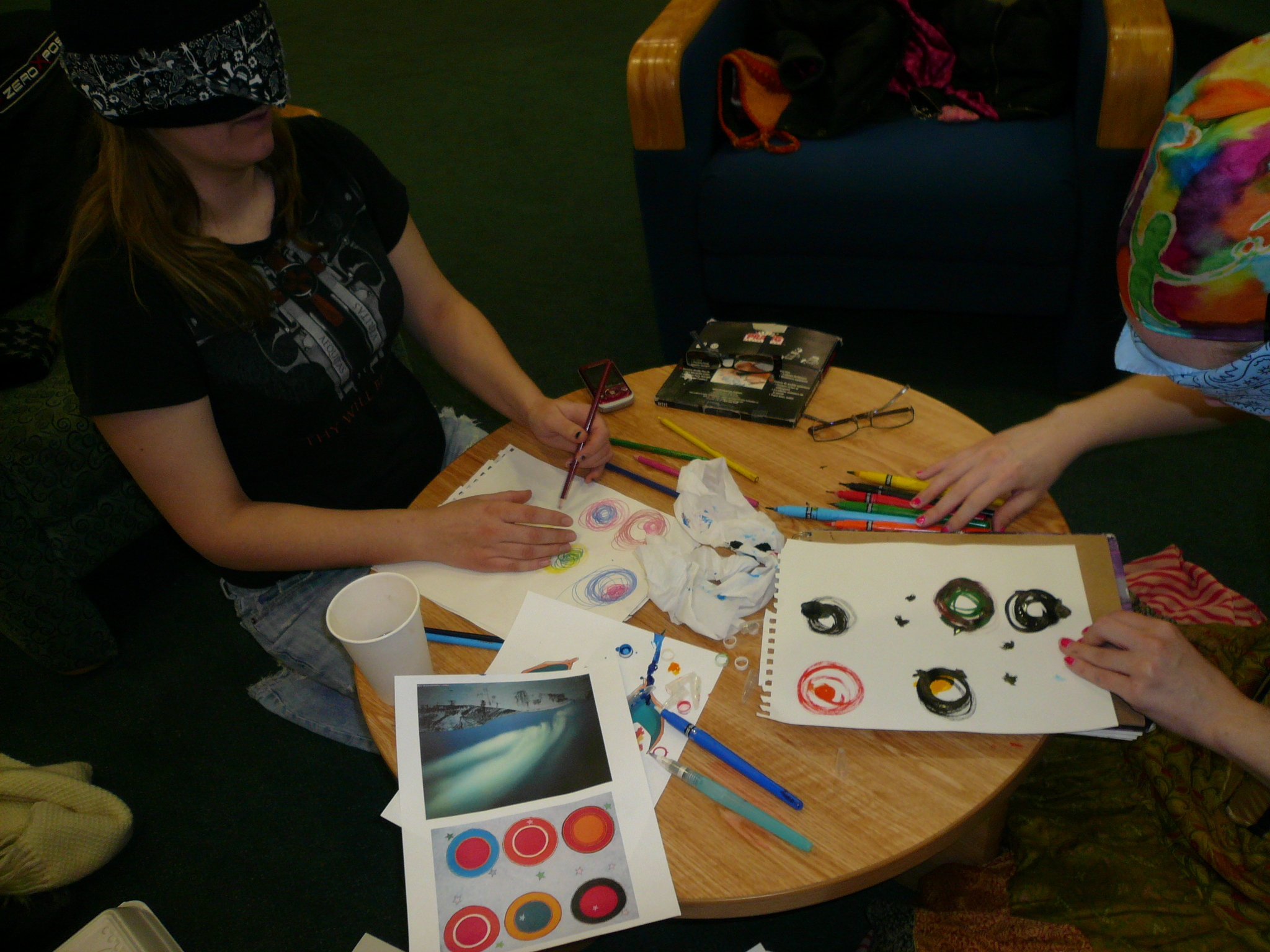 ANYHOO, There were three rounds, each with us attempting to recreate a different picture. Mary-Clare used coloured pencils, Rin used chalk pastels, and I used watercolour pens (which made a HUGE mess). We were all blindfolded and given 3 minutes to draw our pictures. At one point, a woodcenter staff member came over to ask if any of us was using paint, because we weren't allowed to be blindfolded if we were. Christine, like a good task assistant, lied and said we weren't painting. As I painted. And the lady believed her and left us alone. So HA!