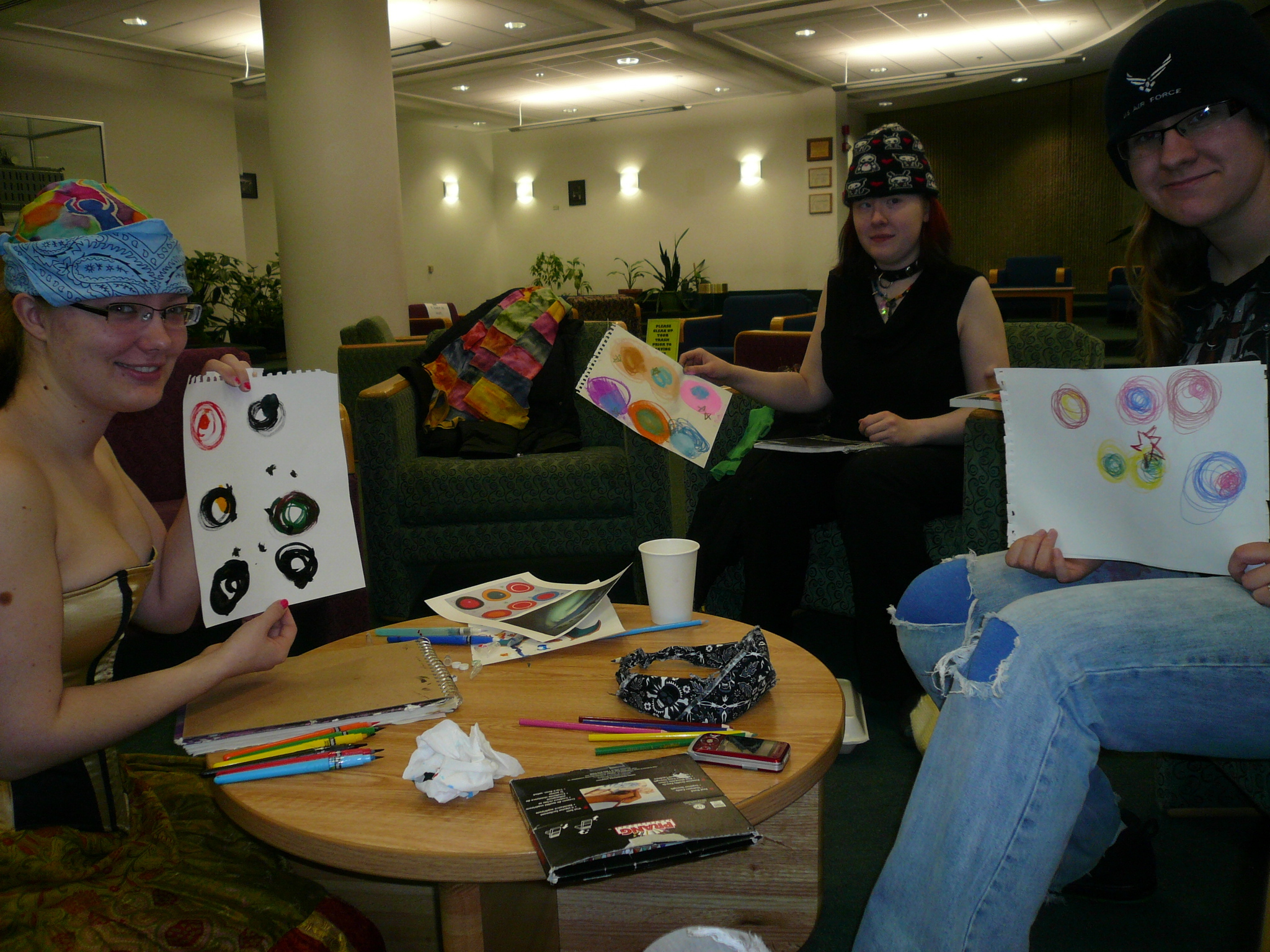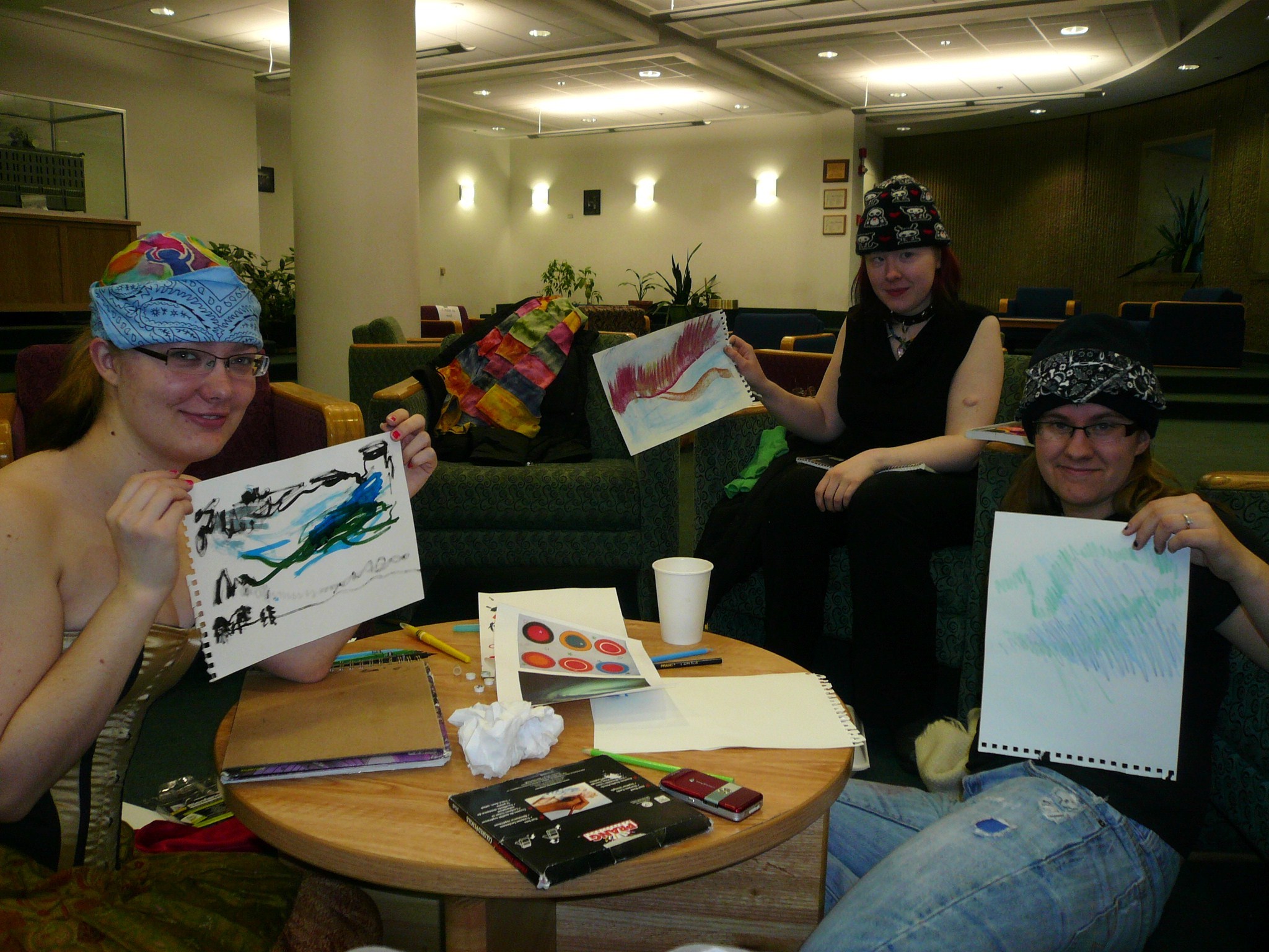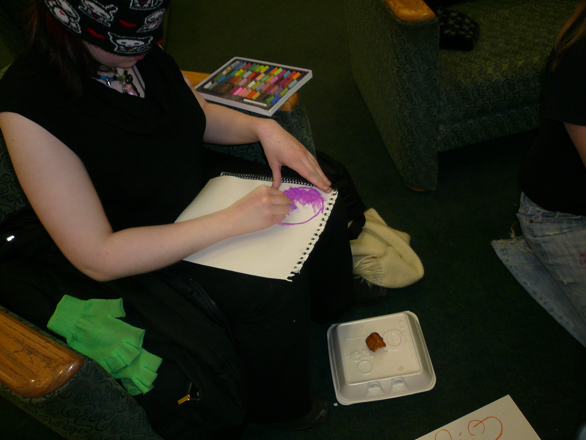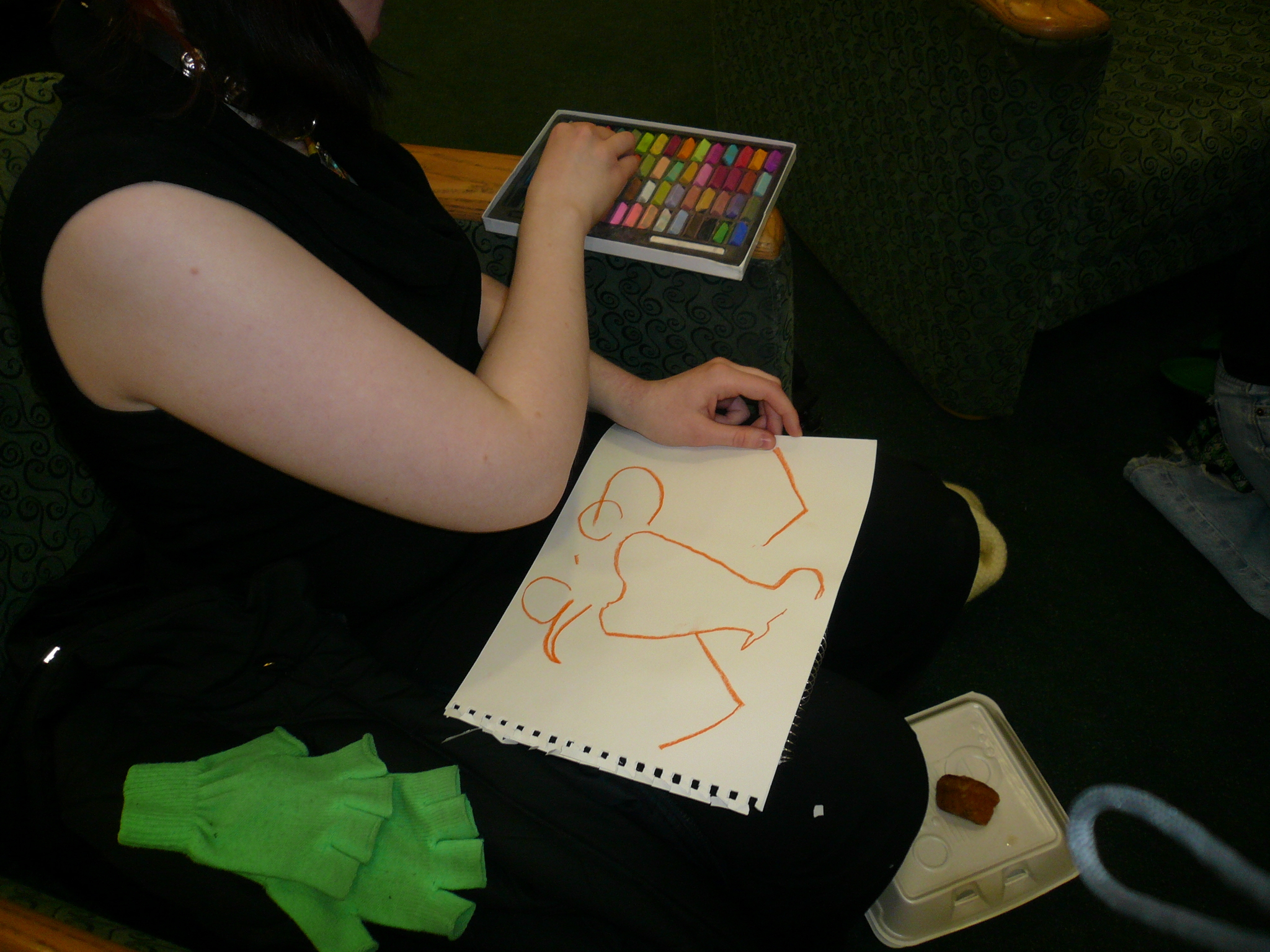 November 21st, 2009 5:35 PMAfter many texts and phone calls, the "contest" (which wasn't really a contest, because there were no prizes or points) ended up being between just me, Rin, and Mary-Clare. I was hoping to bring in Cody and our non-player friends Saryn and Jeremy, but they were LAME and couldn't make it. ;P My roommate Christine came along and acted as our judge, assistant, and photographer, and a few people came and watched. We made our art in the Wood Center, a big public place, which to my enjoyment meant that I actually got to run into my icky ex-boyfriend and his new lover while wearing a corset. :)