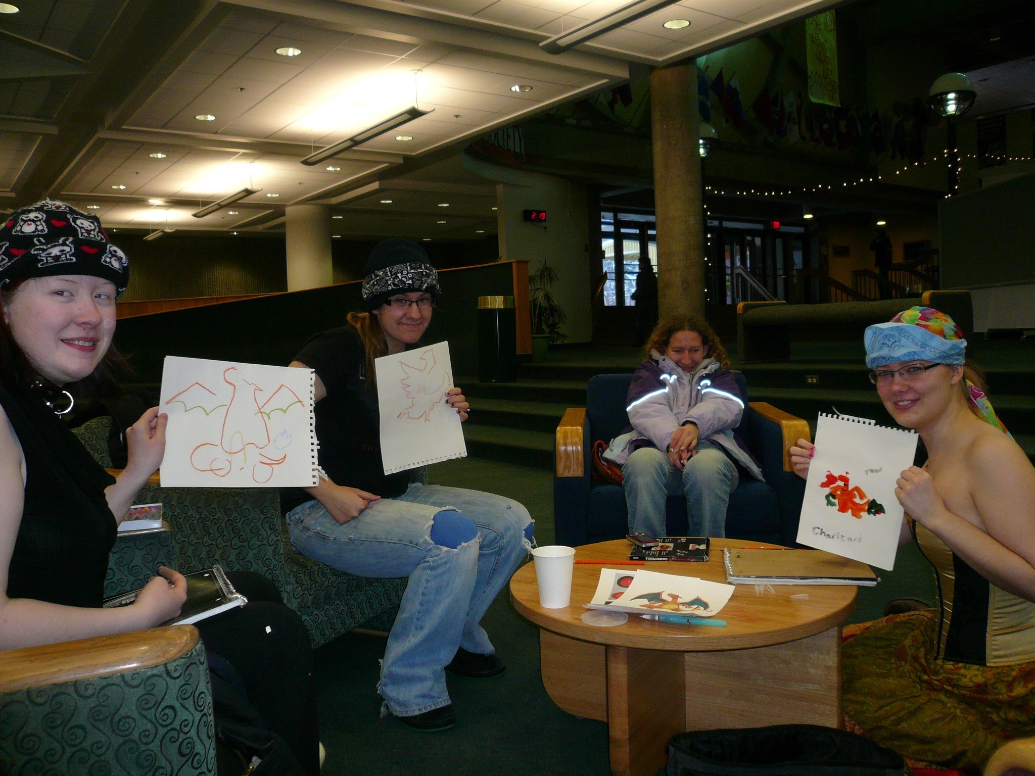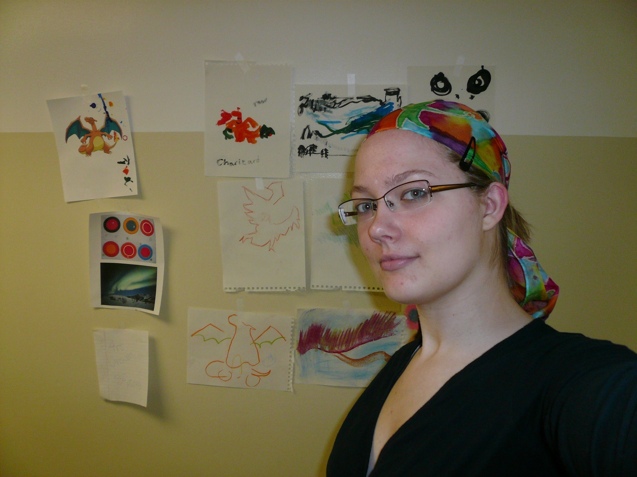 After Christine and I got back to our dorm, I remembered the putting the art on display part. So I found an open wall in my dorm and put them up in chronological order, with each of the three artists getting a different row. I also put up our reference pictures and a sign referencing sf0. I think if someone looks at the display, they'll be able to figure out what was going on. :)