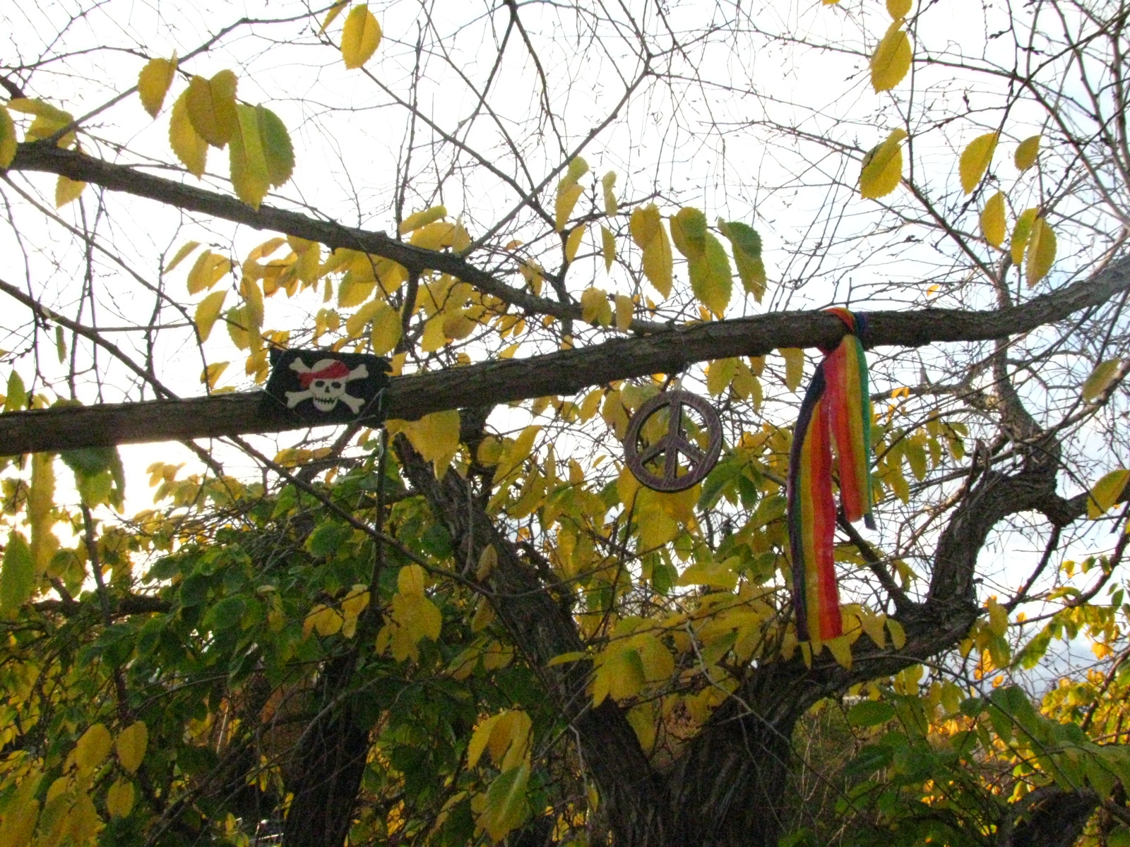 All the pretty art I hung in my tree ^_^ Fun fact: I hung the peace sign and flag with dental floss. :)