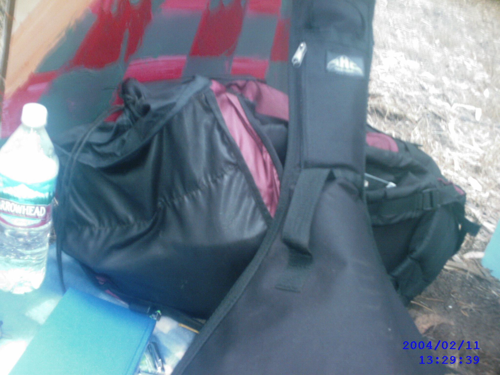 Bag contains - GPS - sleep bag - food - toiletries - books - blanket - light - journal