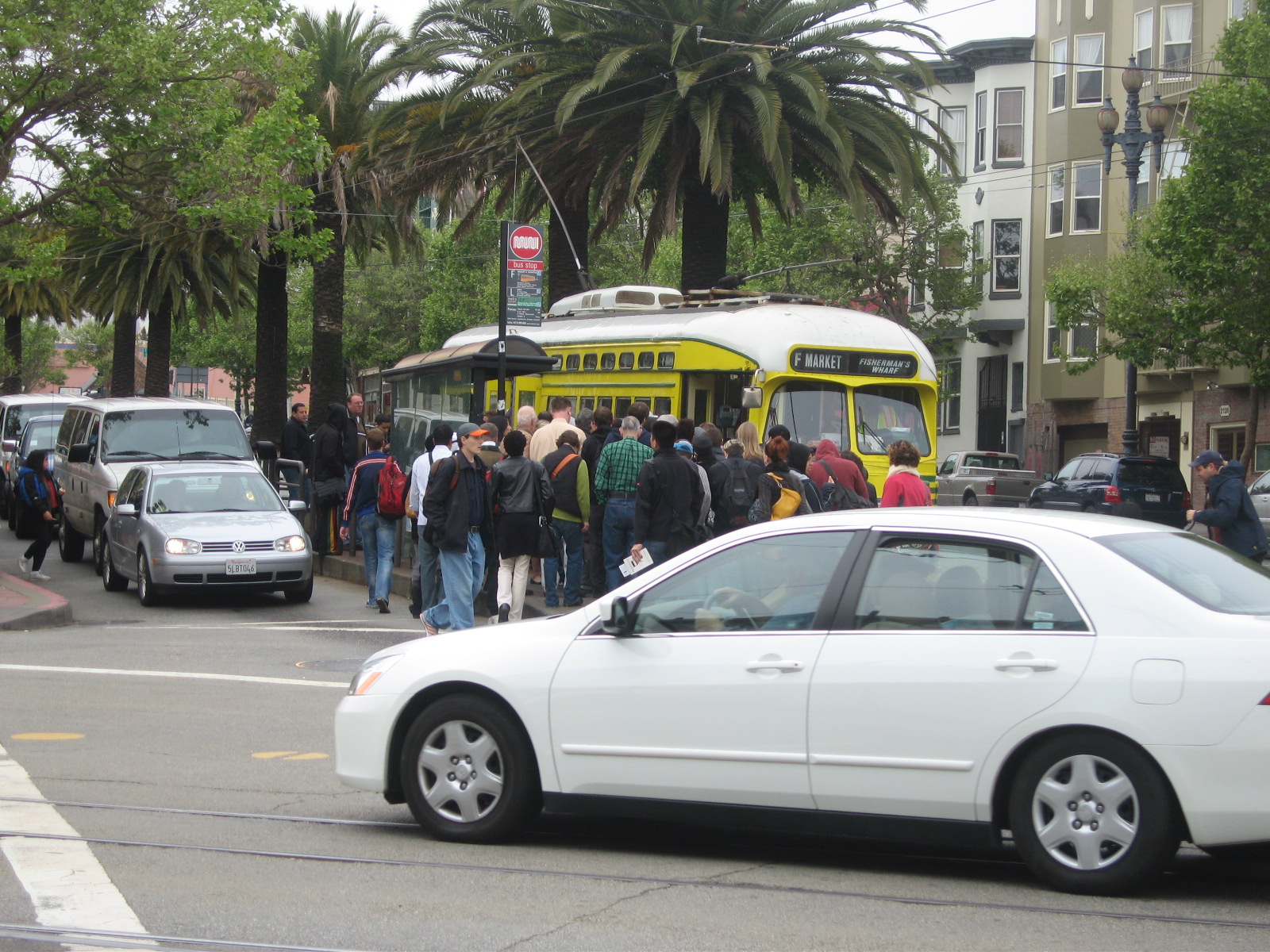 It was too late to get pictures of the confused folks milling about Duboce and Church, but I could still get pictures of people trying to cram onto the F. I watched as the first car that arrived, a yellow trolley, was crammed ridiculously full of rerouted passengers. And then watched the second car arrive and go by with a sign that said "TEST CAR. NO PASSENGERS." Man, what timing.