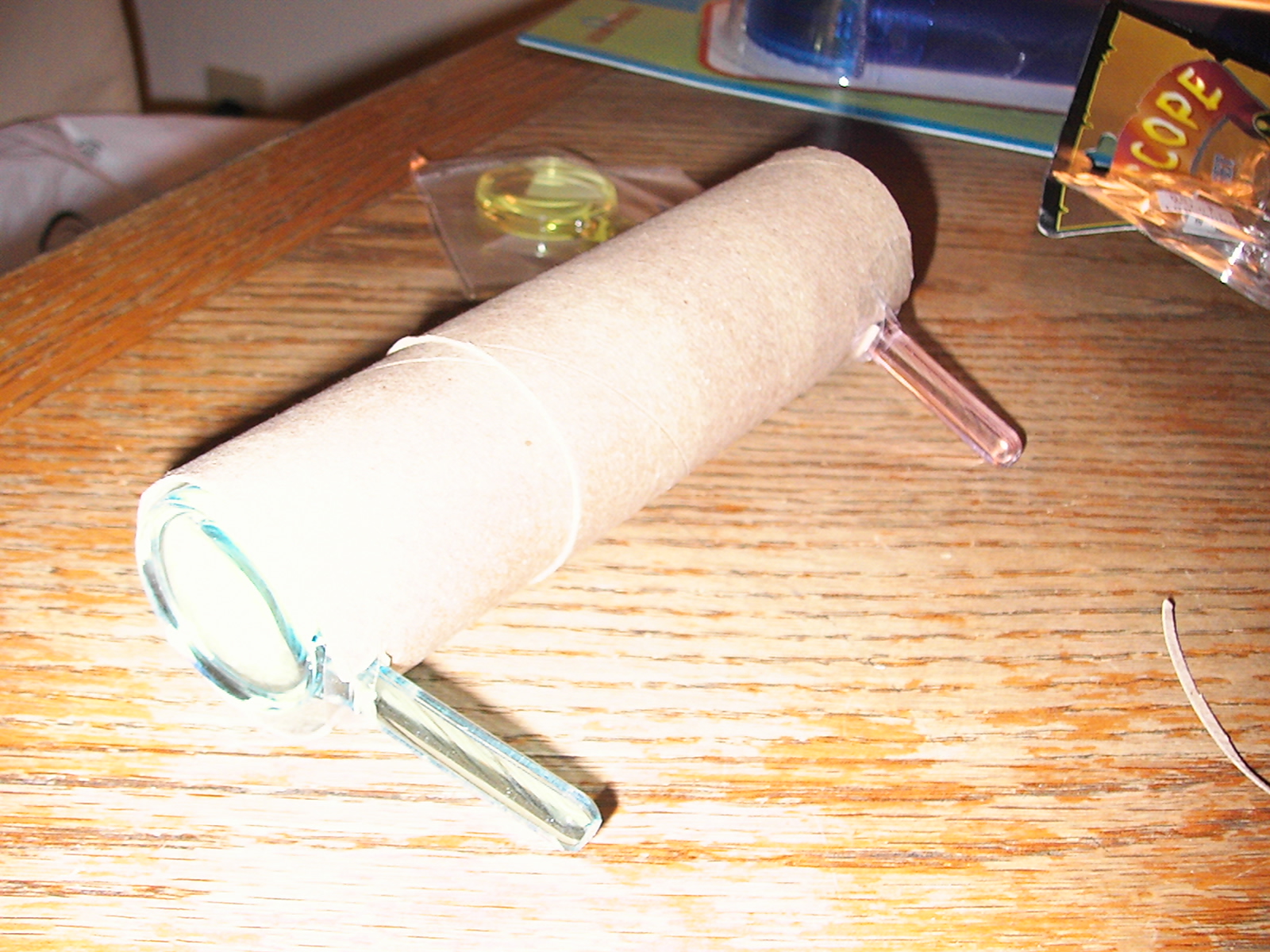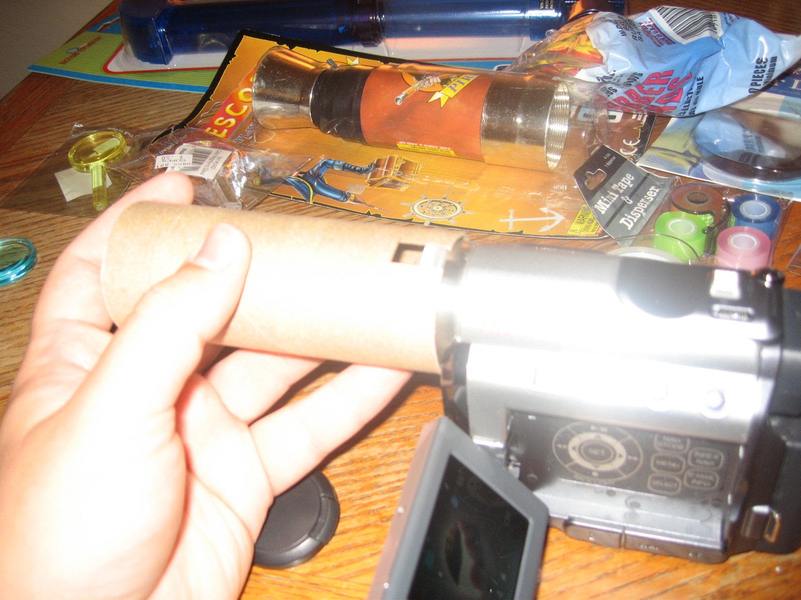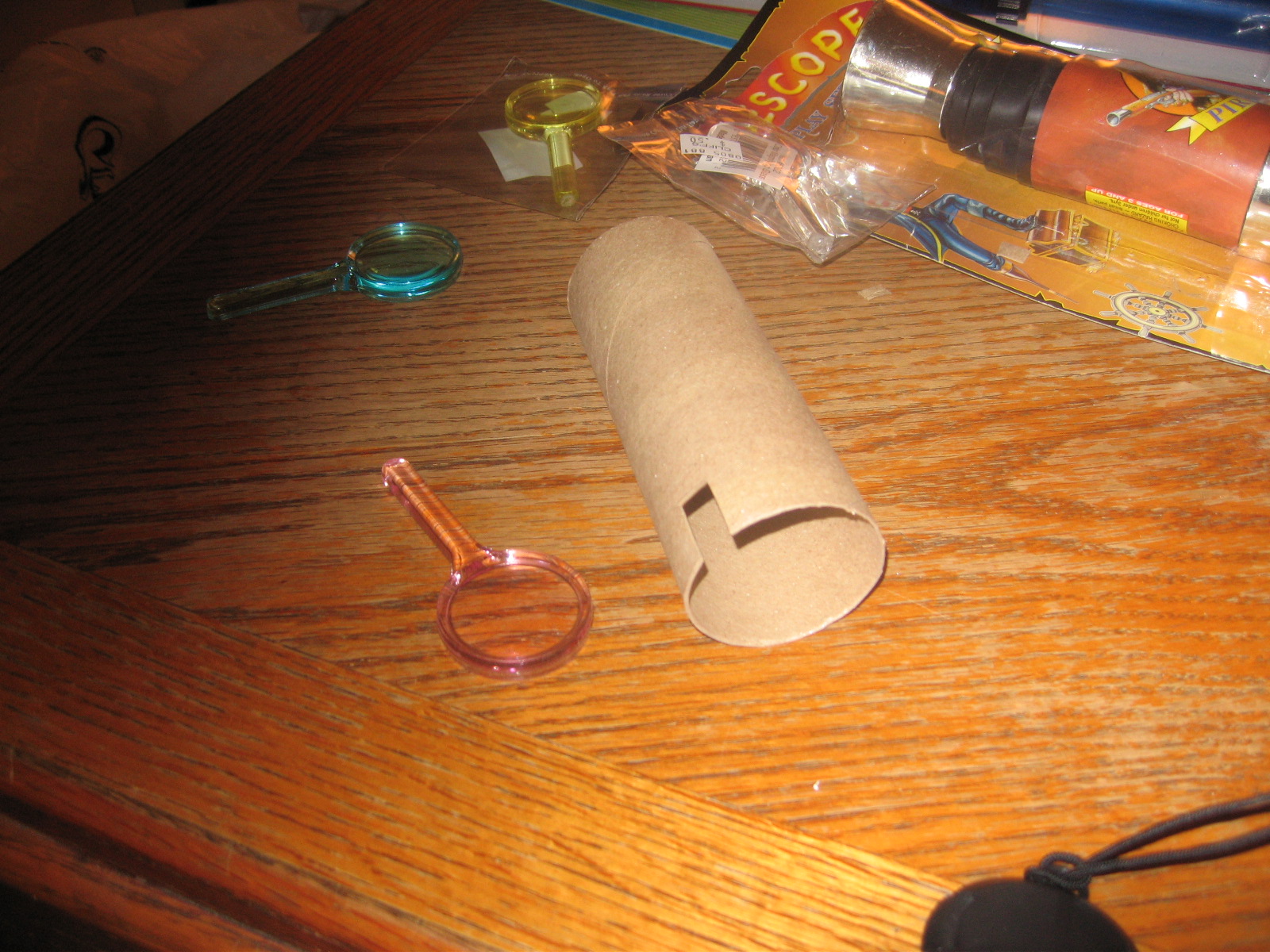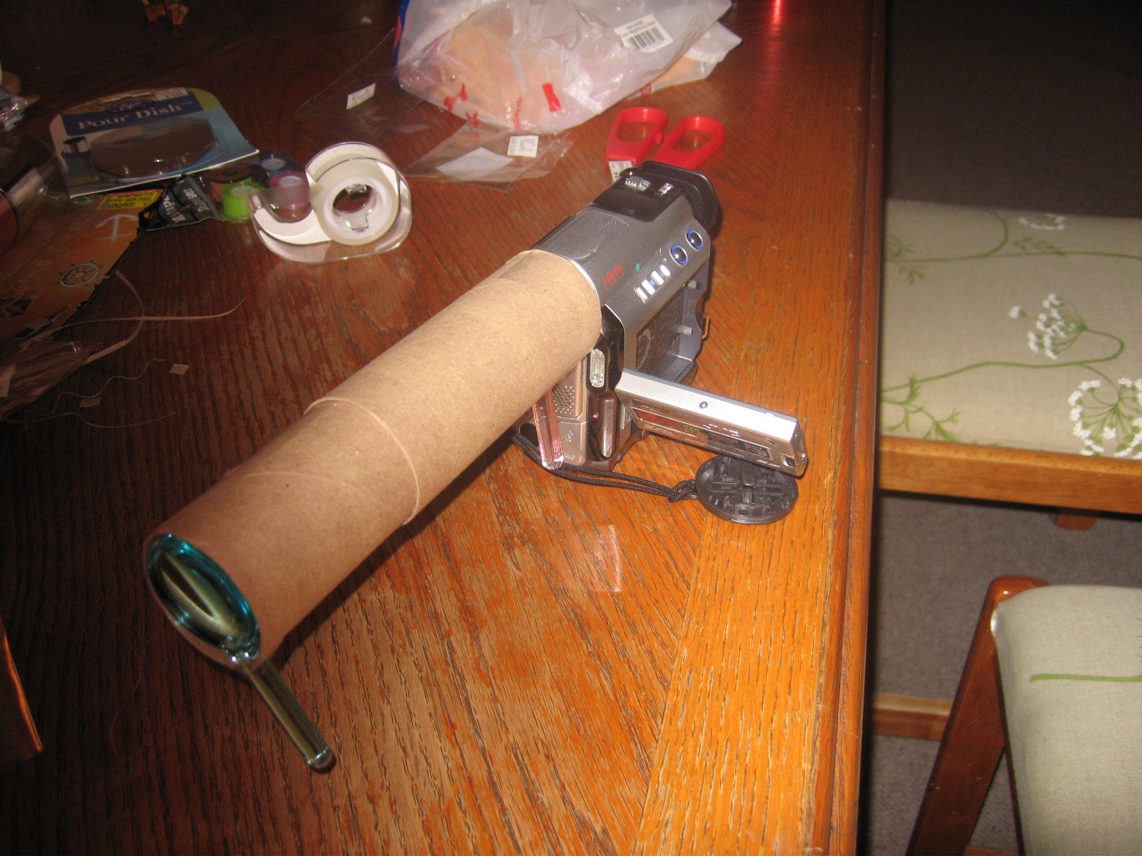 I forgot that I had gone supply-hunting for this task back in March, and then my appendix burst and I never got around to using them. One of the things I rediscovered when I was looking for materials was that two magnifying glasses, when held at the proper distance apart, will pass a clear (or mostly clear) image to the viewer, only upside down. Using two imperfect toy magnifying glasses tinted lightly pink and blue, I constructed a telescopic barrel out of empty toilet paper rolls and just taped the whole thing onto my camera. Because of the length of the tube, if I wanted to avoid the porthole effect, I had to zoom the camera in about halfway.