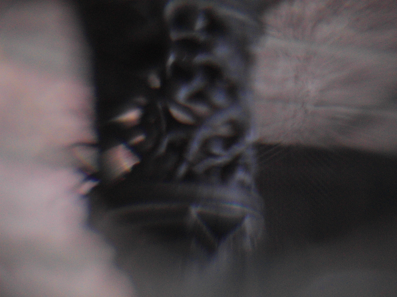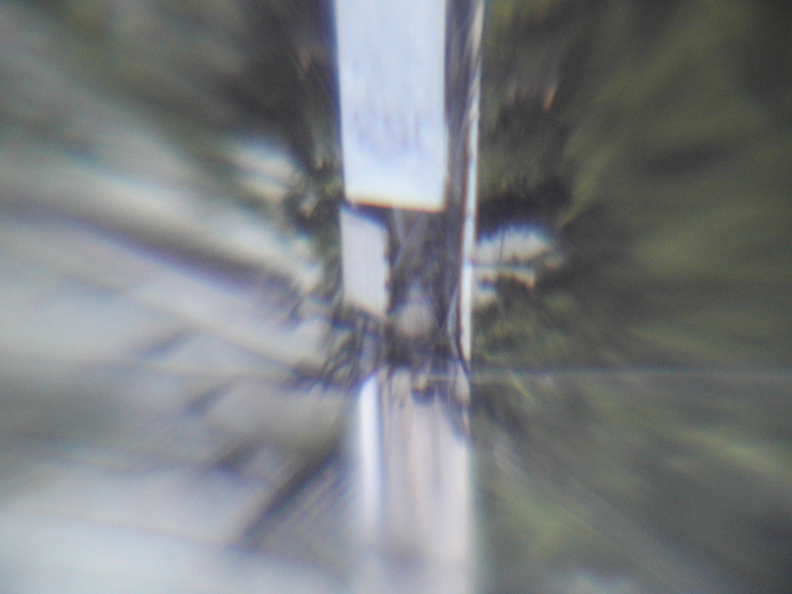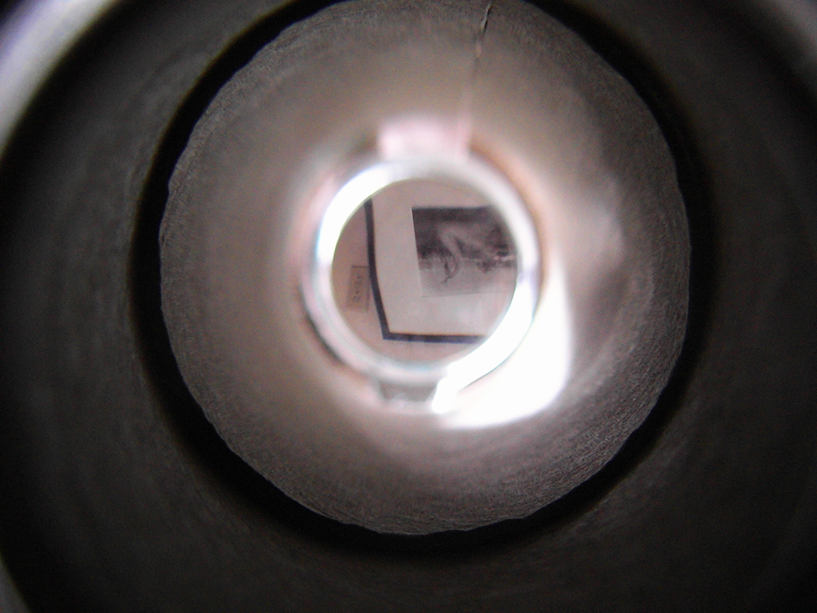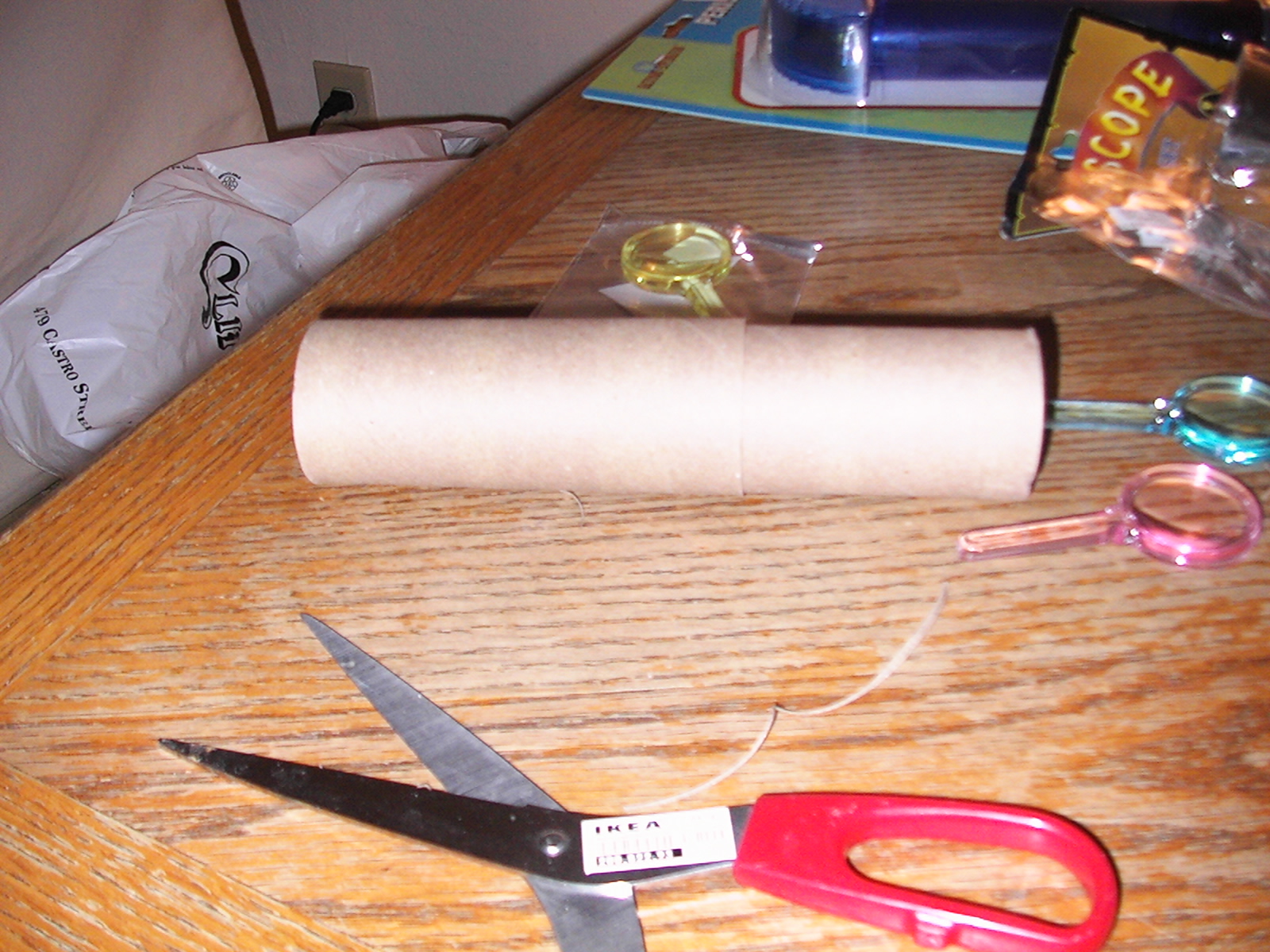 I forgot that I had gone supply-hunting for this task back in March, and then my appendix burst and I never got around to using them. One of the things I rediscovered when I was looking for materials was that two magnifying glasses, when held at the proper distance apart, will pass a clear (or mostly clear) image to the viewer, only upside down. Using two imperfect toy magnifying glasses tinted lightly pink and blue, I constructed a telescopic barrel out of empty toilet paper rolls and just taped the whole thing onto my camera. Because of the length of the tube, if I wanted to avoid the porthole effect, I had to zoom the camera in about halfway.