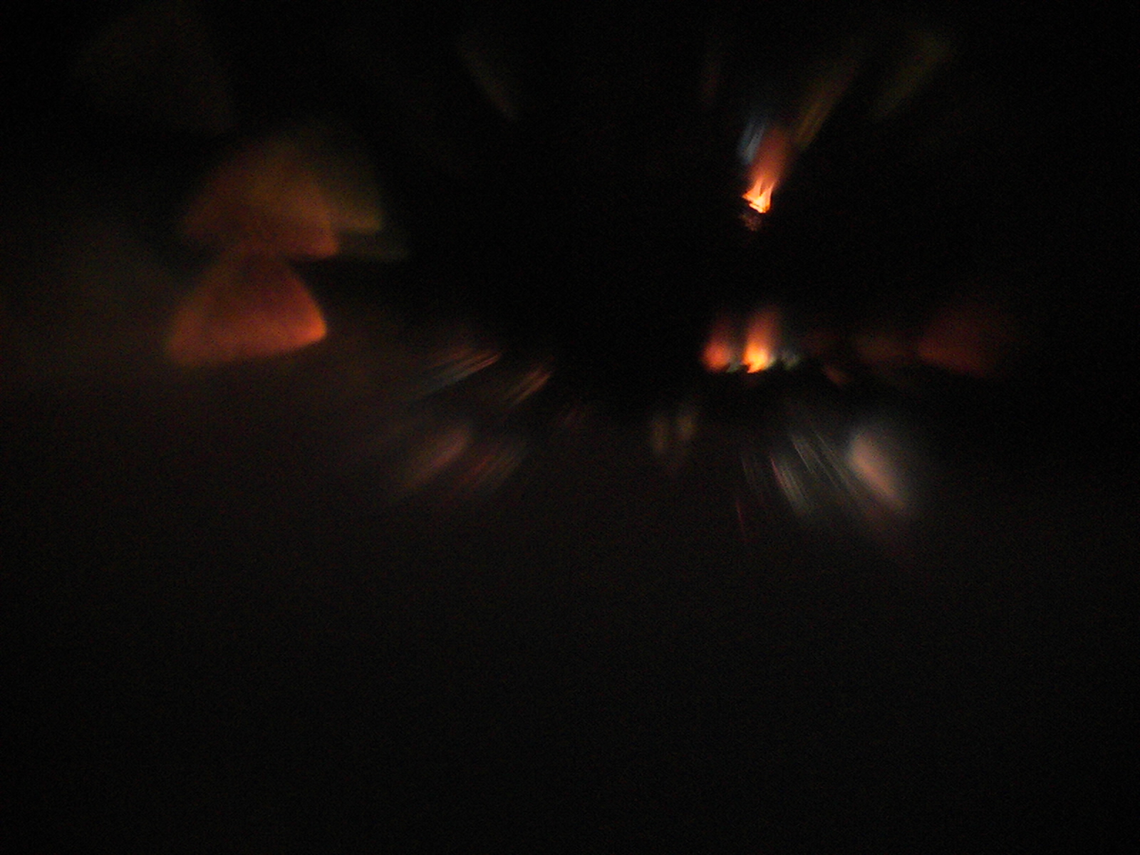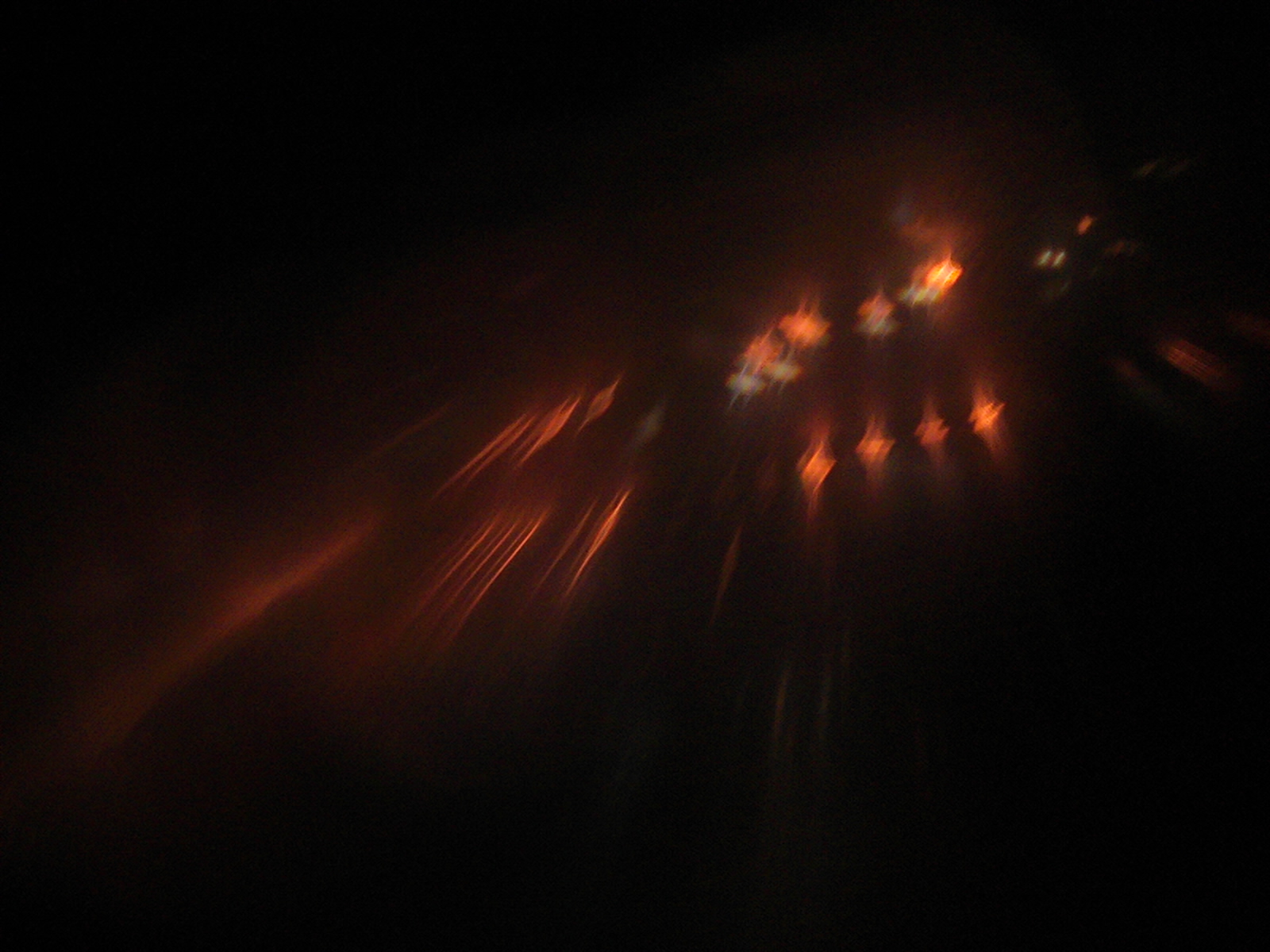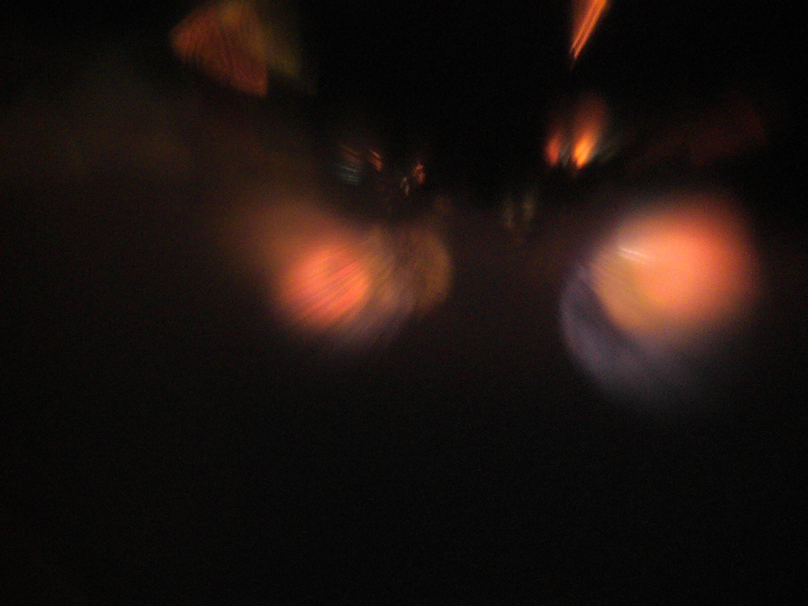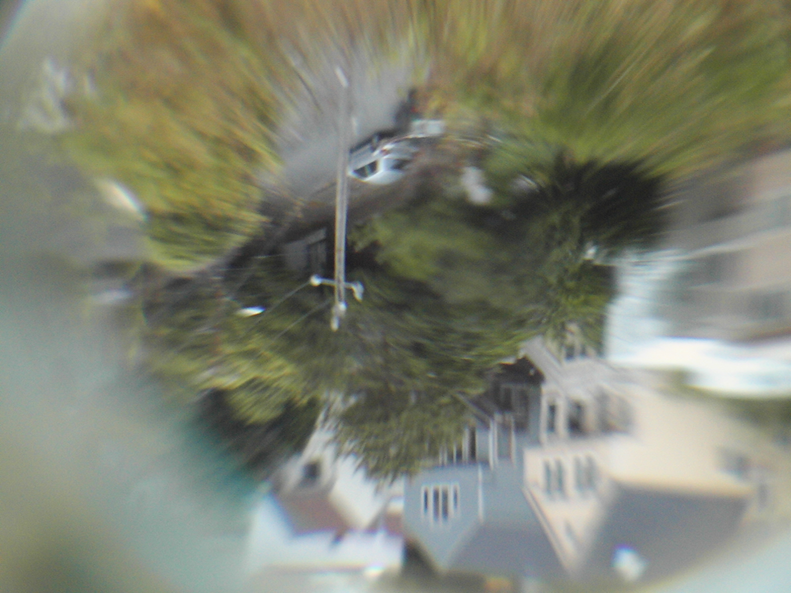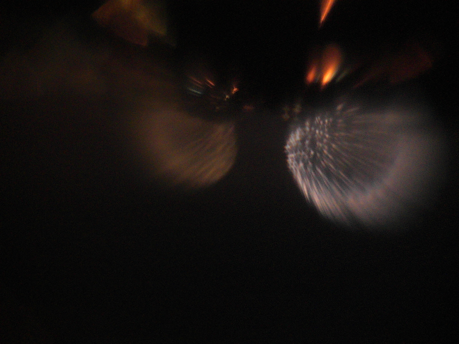 The pictures that I ended up taking with the new apparatus were strange, warbly, and of course upside down. I took some from Kite Hill and those turned out just slightly strange enough, as if I were floating below an upside-down city. Tonight I took some pictures of the fireworks as seen from a distance in our living room, and those turned out as if shot from a car wash.