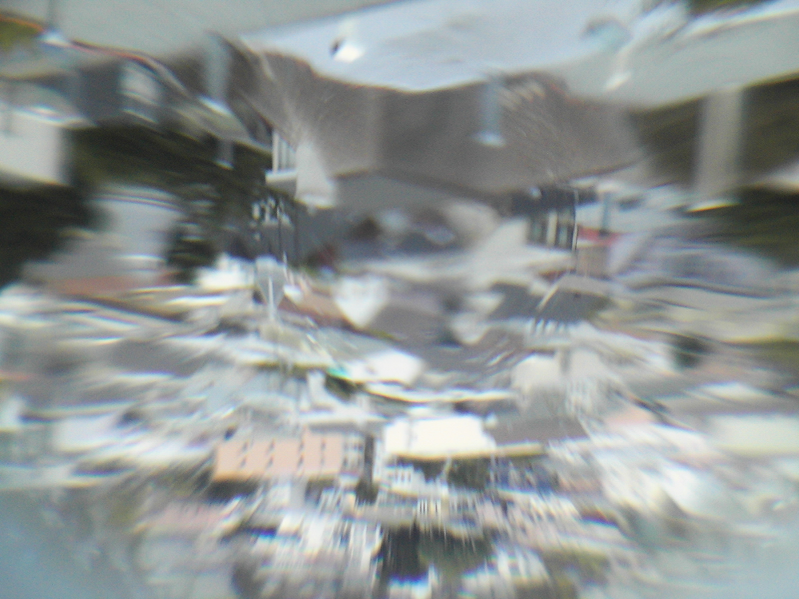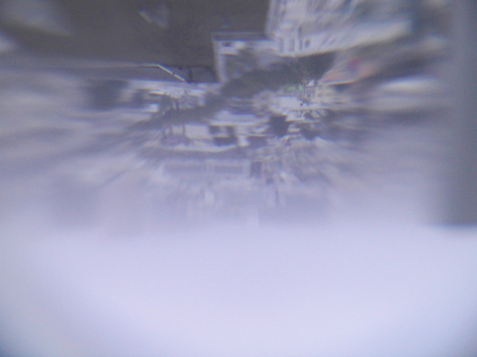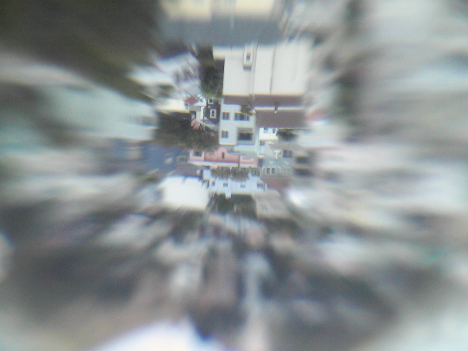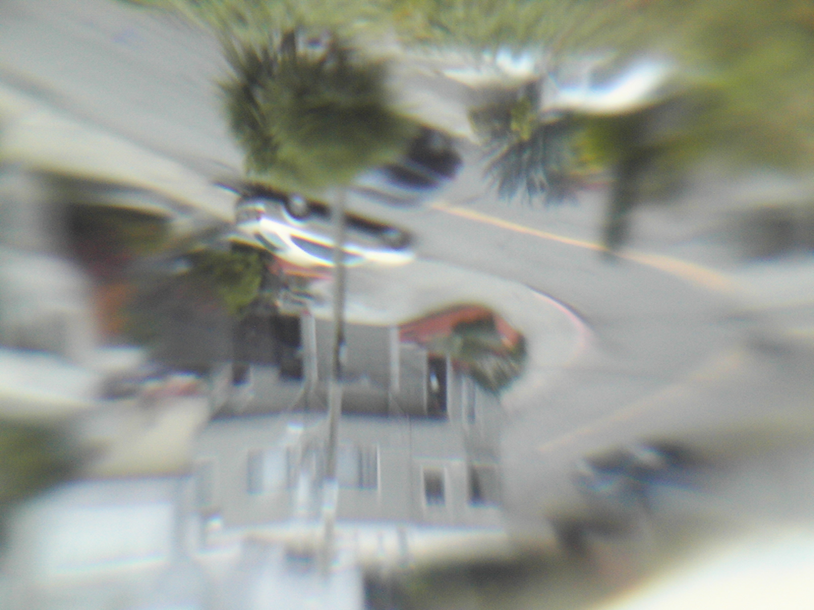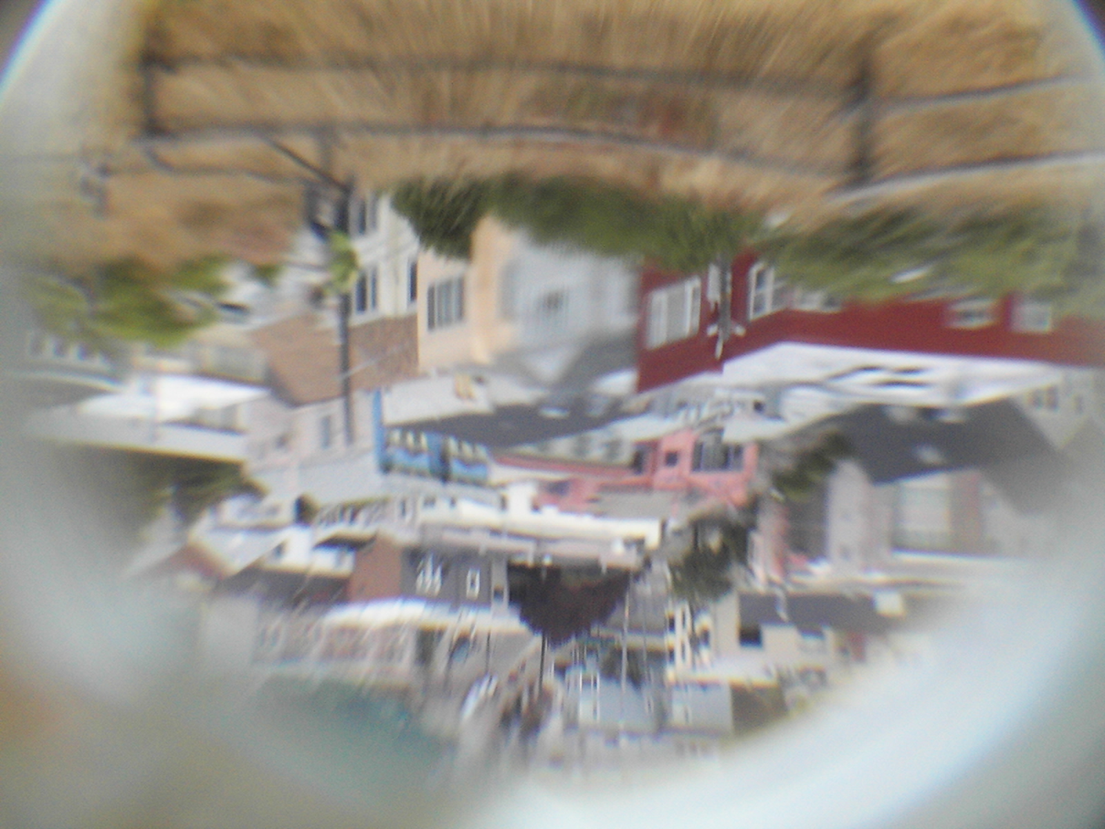 The pictures that I ended up taking with the new apparatus were strange, warbly, and of course upside down. I took some from Kite Hill and those turned out just slightly strange enough, as if I were floating below an upside-down city. Tonight I took some pictures of the fireworks as seen from a distance in our living room, and those turned out as if shot from a car wash.