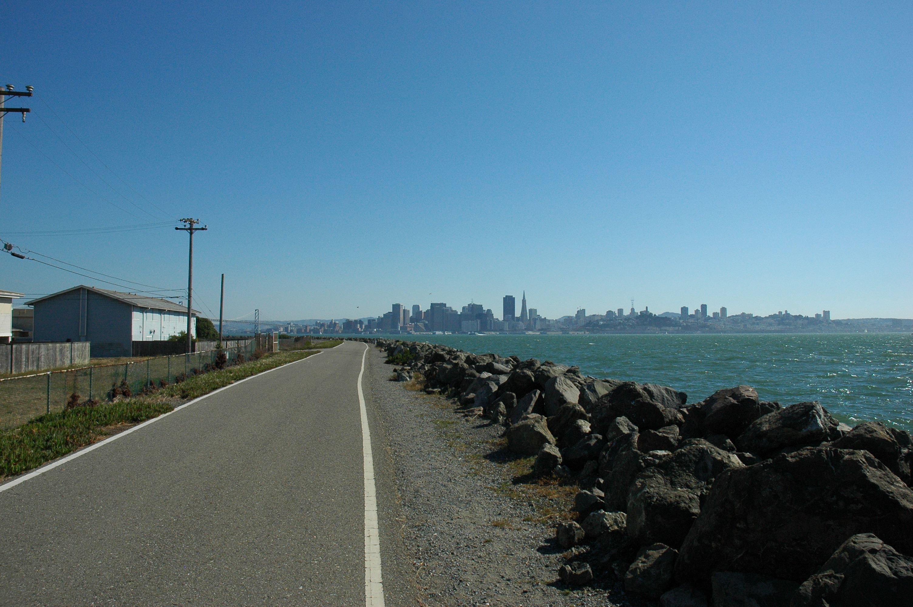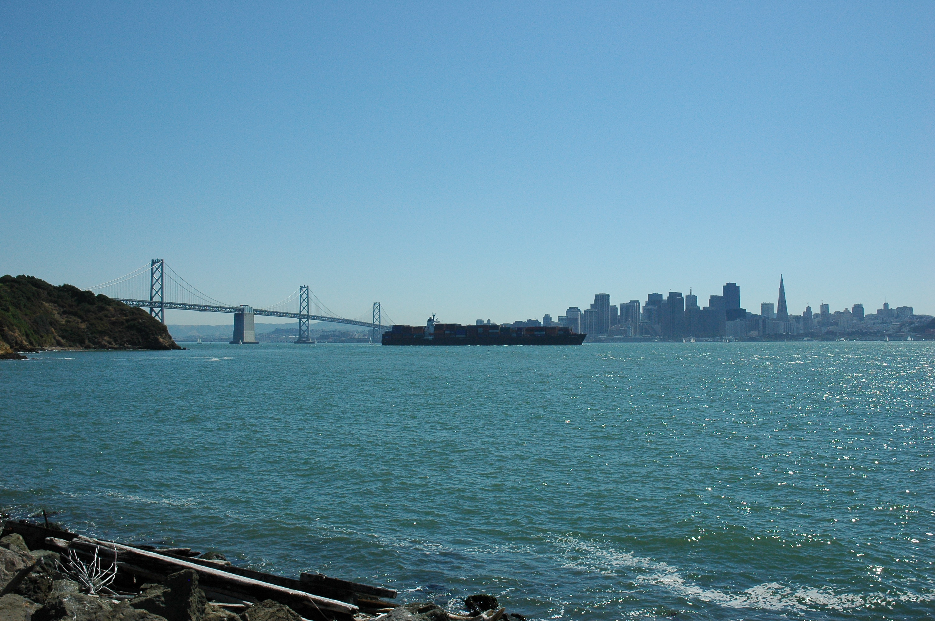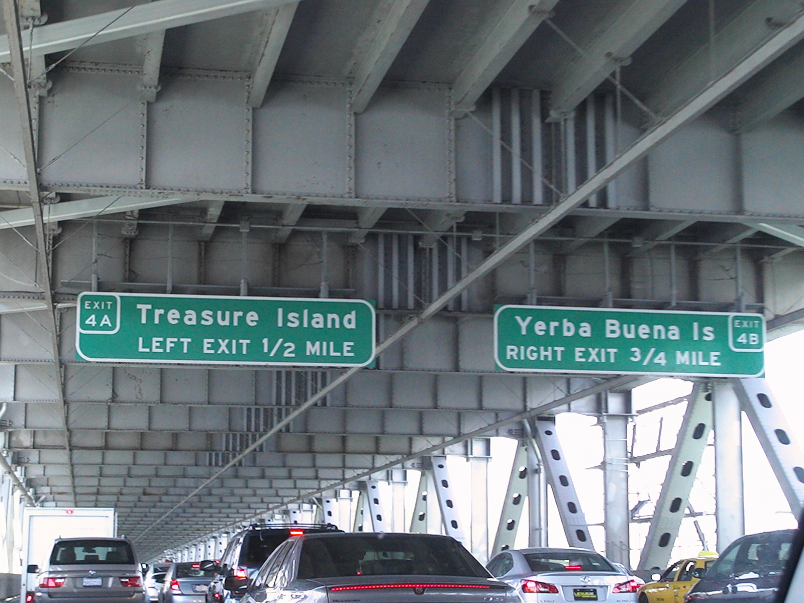 Saturday, we put a treasure tin together and headed out to do this, before Martina had to go back to London. We ran into trouble just getting to the island... there was a traffic jam on the Bay Bridge and it turned out that someone had run into the sand barrier on the off-ramp going for the island, and we couldn't even take it. We ended up going all the way over the bridge, and pulled a quasi-legal u-turn as soon as we could, before it would involve a toll on the way back. Back up and over and we were in.