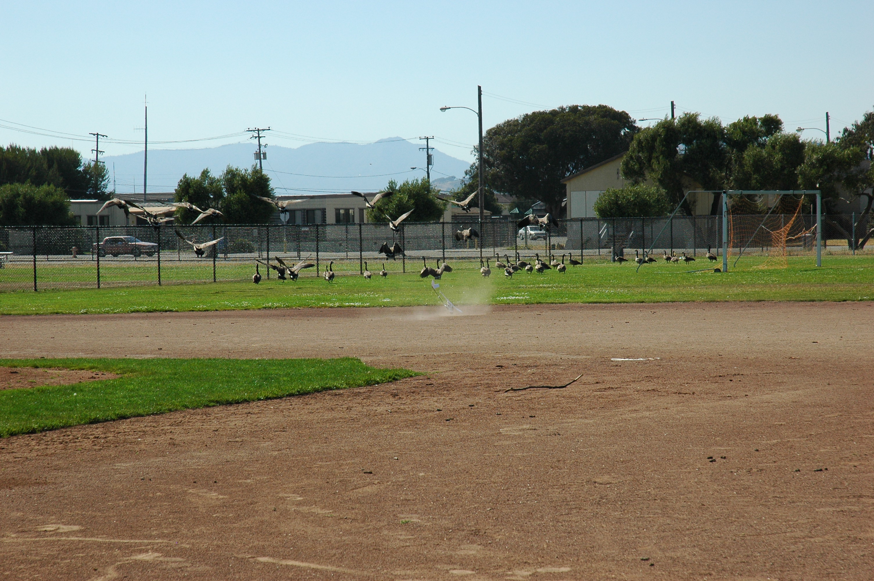 We found a seemingly-forgotten park taken over by geese, and placed our treasure inside one of the climbing domes. Later we'd see a couple guys come on the baseball field with a radio-controlled flyer, charging the geese fearlessly with the plane.