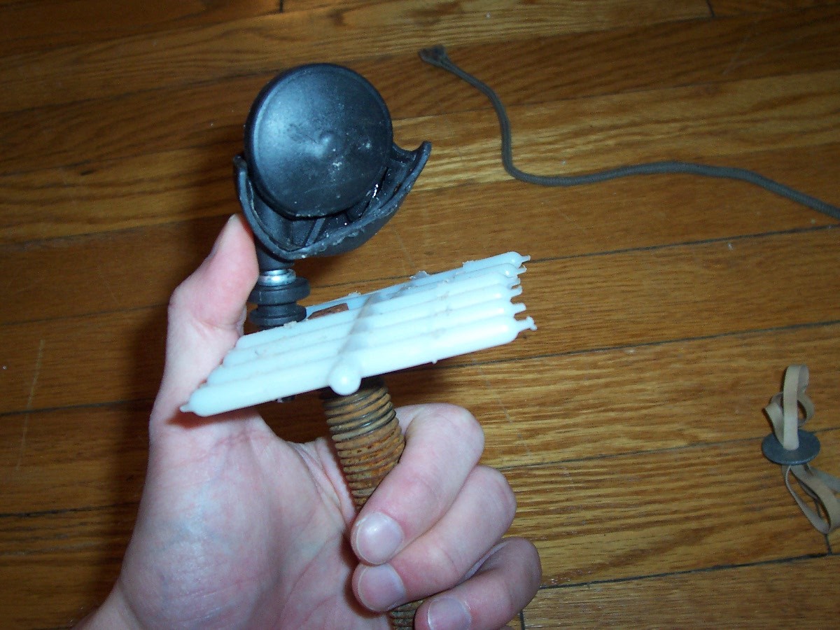 The large bolt makes for a solid base especially with the nut supporting it upright. The opposite end of the bolt had a cubed peg which these plastic things fit around almost perfectly. The wheel had ridges that held it in place between the posts of the plastic things. Hm, I think I see something emerging.