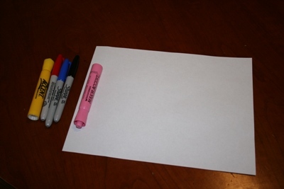 What I used to write my secret message. One (1) sheet 8-1/2" x 11" 20 lb. blank paper. Three (3) fine-point Sharpie brand permanent markers (black, blue and red). Two (2) Sanford brand highlighting markers (pink and yellow).