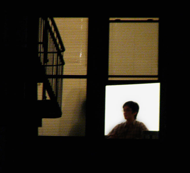 Anyway, it was a busy night on cocktail row, so I ducked into a side street in the area near Geary and Leavenworth and spied a couple having an animated discussion in a shady apartment window. I couldn't see faces — just shadows and movement. So I snapped a from-the-shoulder shot and the first photo is what I came up with.