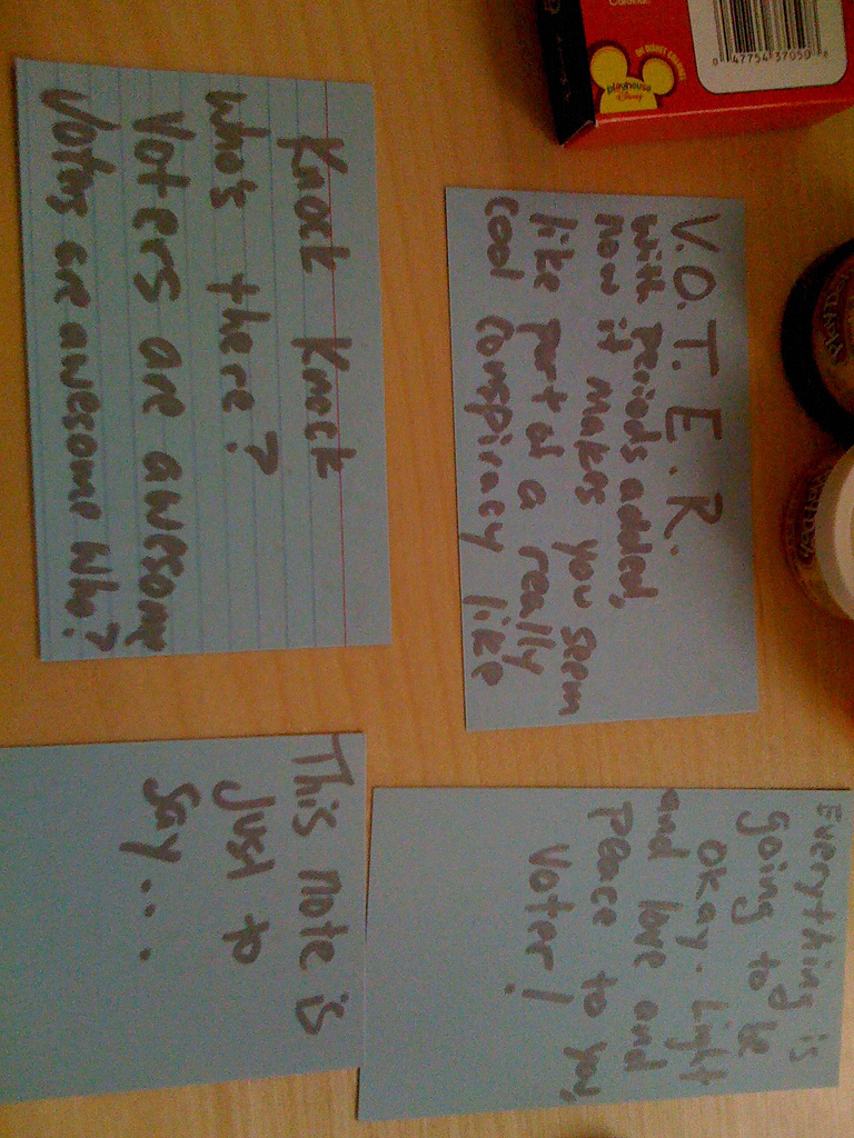 "Knock knock who's there? Voters are awesome. Voters are awesome who? That's it. Voting is no joke. THANKS!"