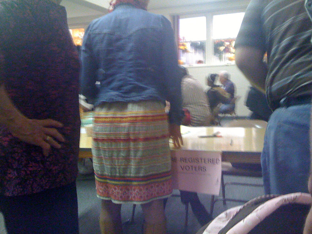 I was at a polling place at the end of the night, ostensibly to make sure anyone who was in line was not denied their rights. There was no one in line. I know one of the judges and we chitchatted. He said I could stay behind as they ran the tally out of the machine. That was neat. Everyone close and relaxed-but-intent on getting things right. It was on the stage of a high school auditorium which I thought was an interesting statement about polling places in general.