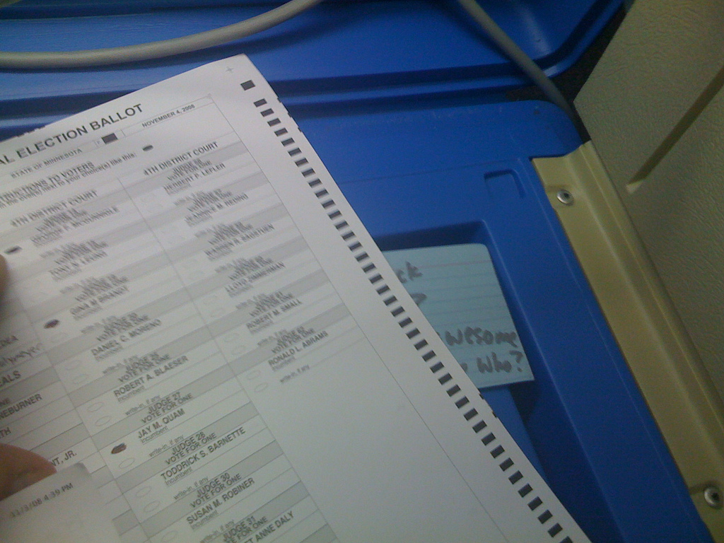 The voting booths are not very good booths, actually. They're totally not private--no curtain or anything. Which meant I'd need to place them discreetly and hopefully in such a way that they wouldn't be noticed instantly and either be removed or have some stuffy election judge demand to know what I was up to. Not to mention somehow tainting or causing them to say I was spoiling my ballot, especially relevant because the laws about leaving identifying characteristics on the ballots have come into play in the Franken/Coleman recount.