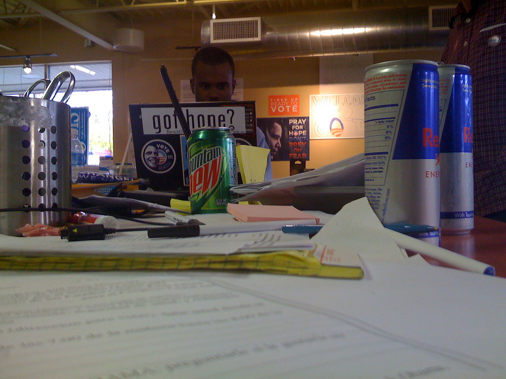 This is the countertop where the office staff worked, with their laptops all set up. You can see they were fueled by mountain dew and red bull. Oh yeah, and HOPE!