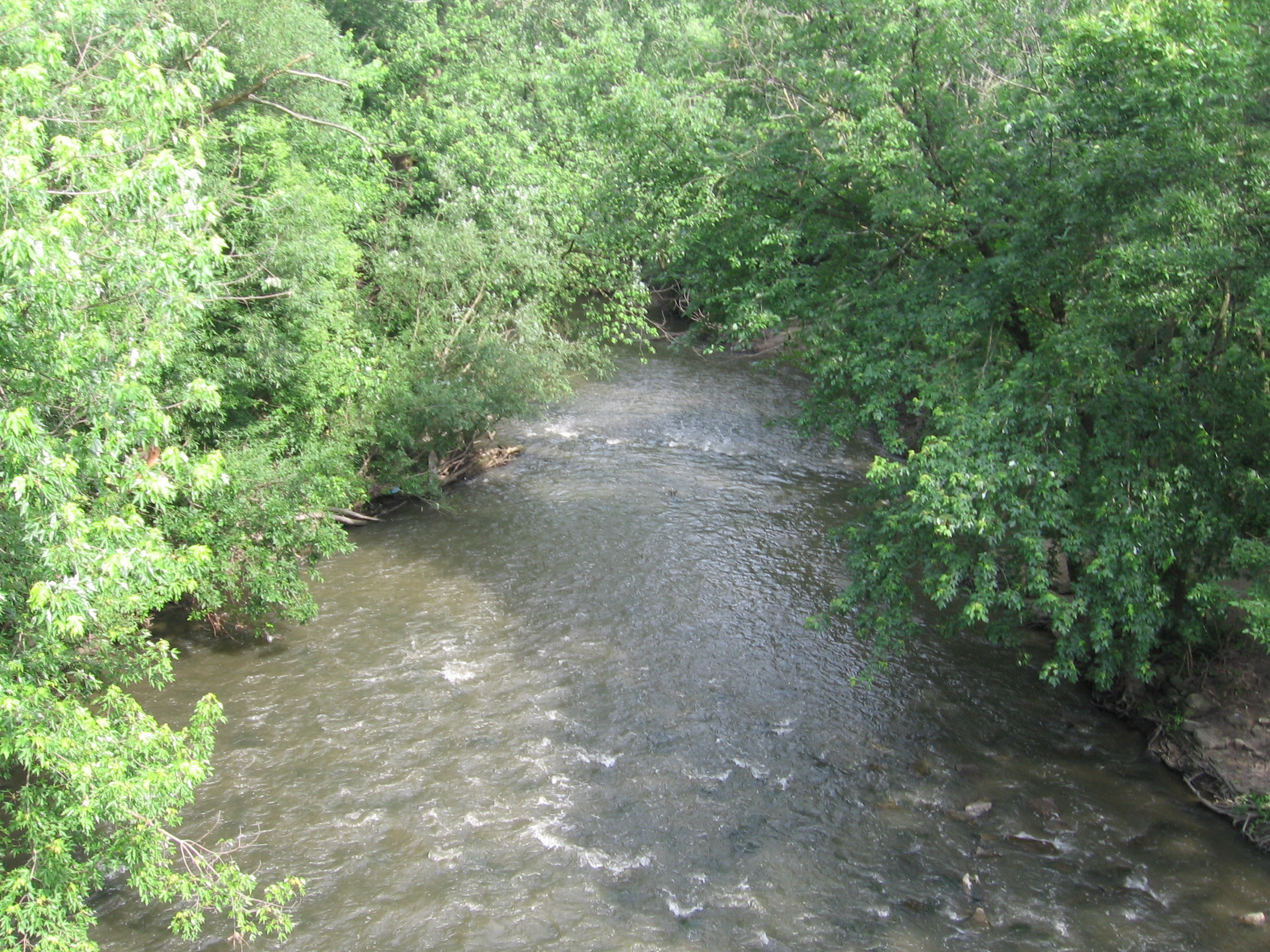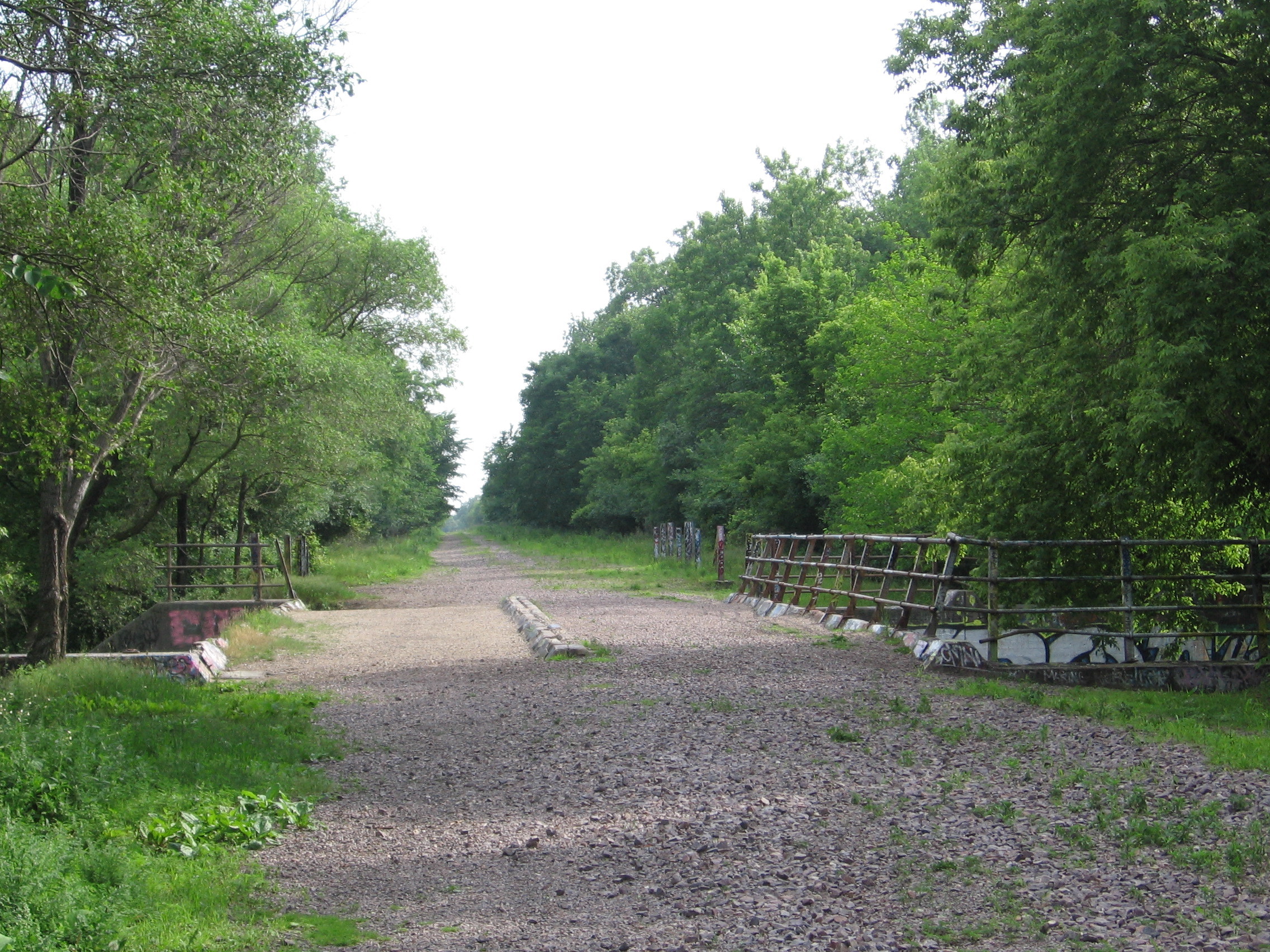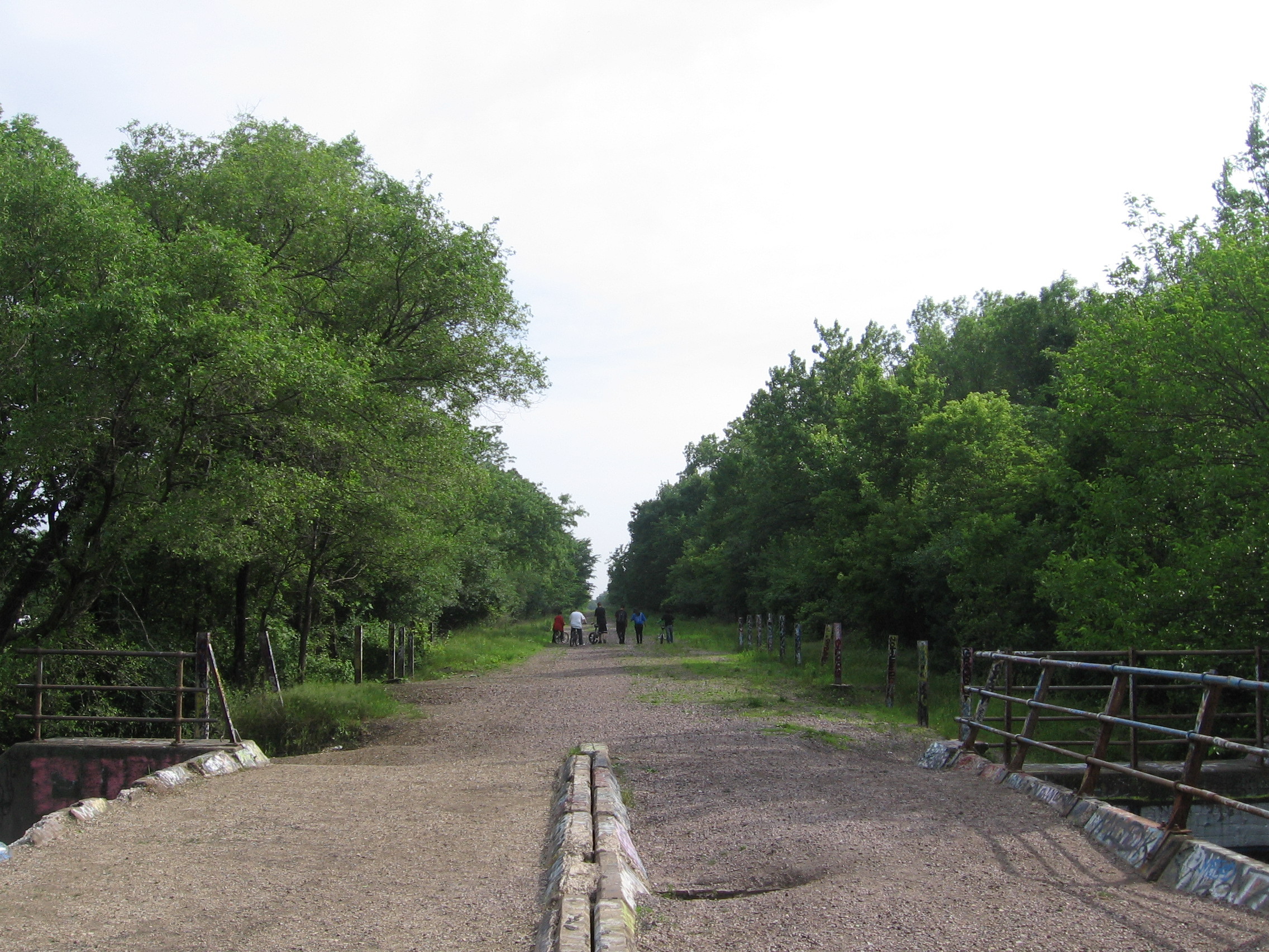 The outcrop here in the middle of the picture (where the bridge ends on the left) is the ledge we're prepping our rope for.